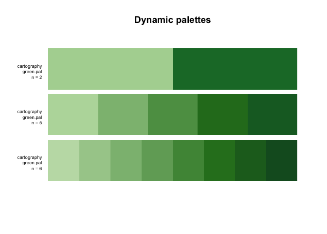 on the other hand we have the dynamic palettes where the colors of the palette depend on the number of colors you need like the green.pal palette from the cartography package:
