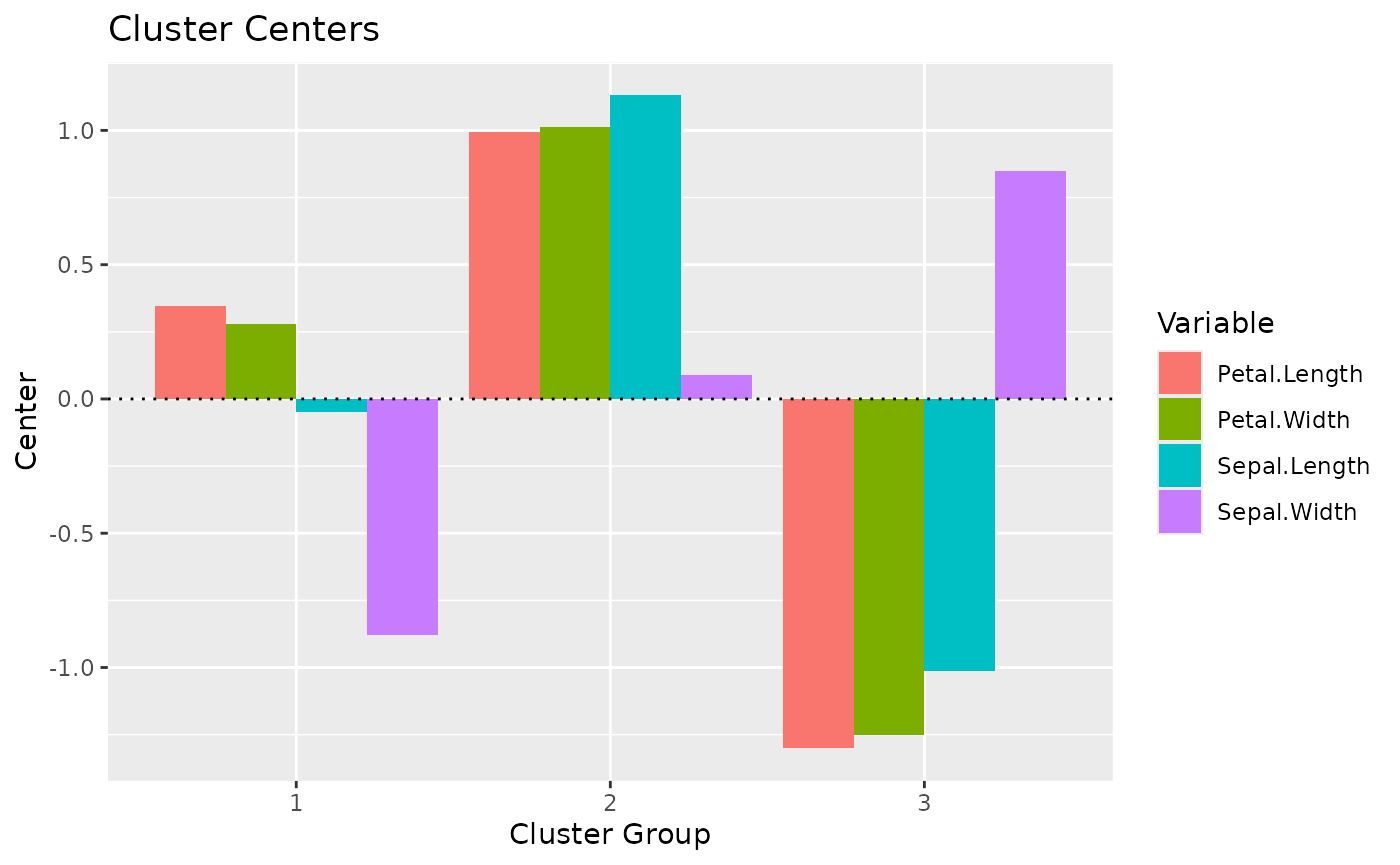 #> Cluster | n_Obs | Sum_Squares | Sepal.Length | Sepal.Width | Petal.Length | Petal.Width