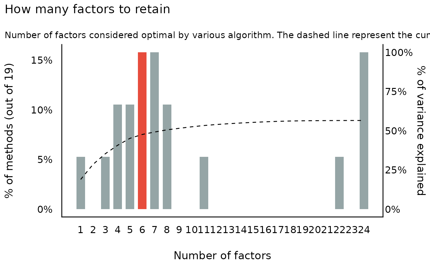 #> 5 -0.17 -0.460 -0.099 -0.712 -0.66When running a factor analysis (FA), one often needs to specify how many components (or latent variables) to retain or to extract. This decision is often motivated or supported by some statistical indices and procedures aiming at finding the optimal number of factors.