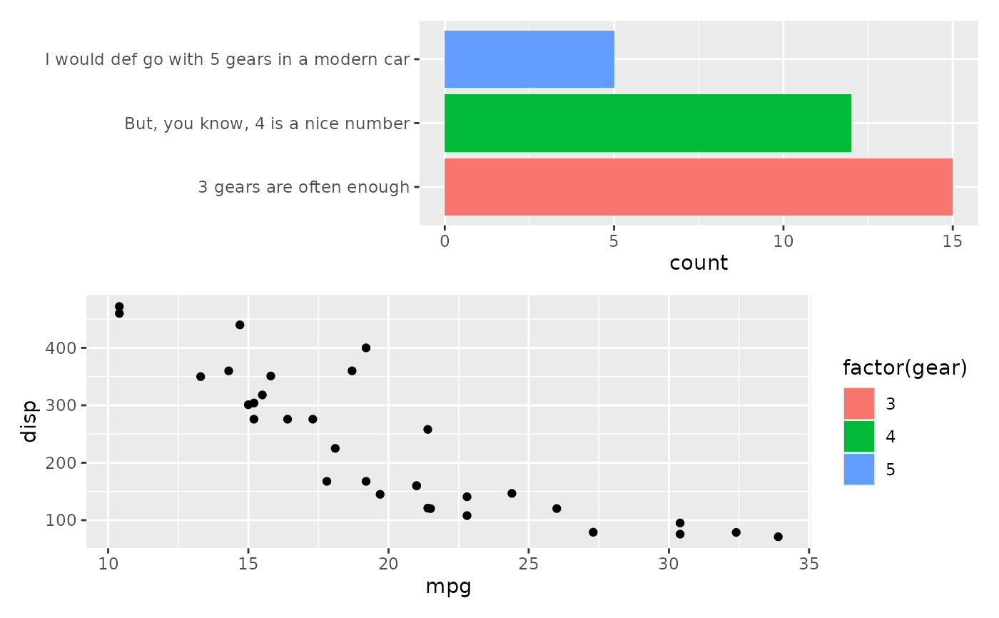 geom_bar(aes(y = factor(gear), fill = factor(gear))) +