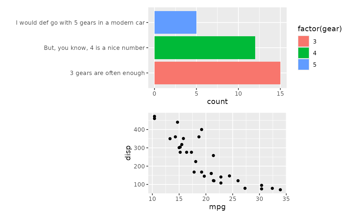 p2 <- ggplot(mtcars) + geom_point(aes(mpg, disp))