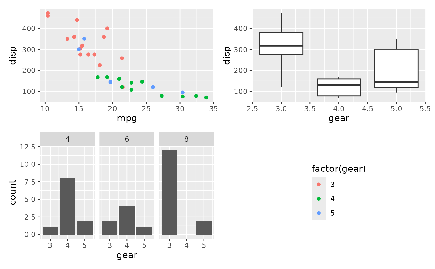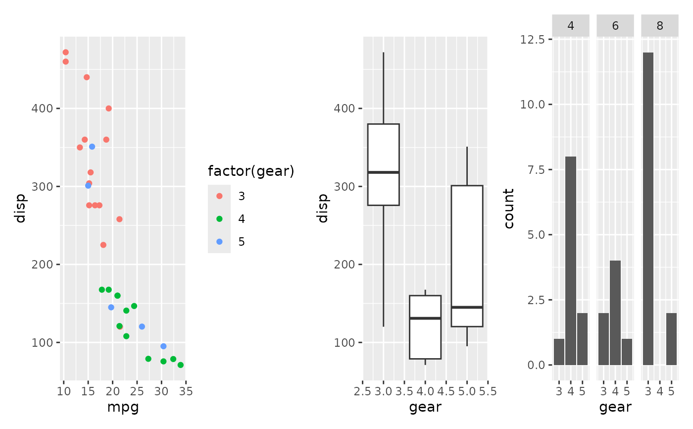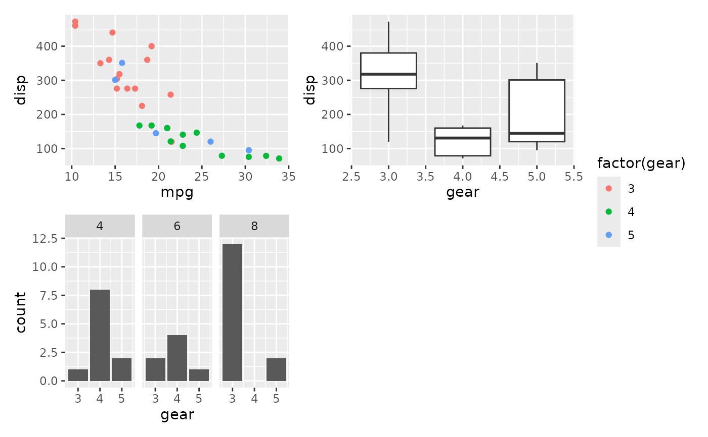 p2 <- ggplot(mtcars) + geom_boxplot(aes(gear, disp, group = gear))