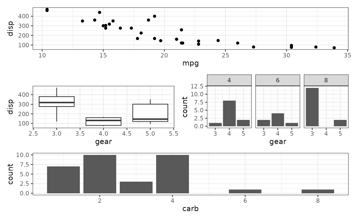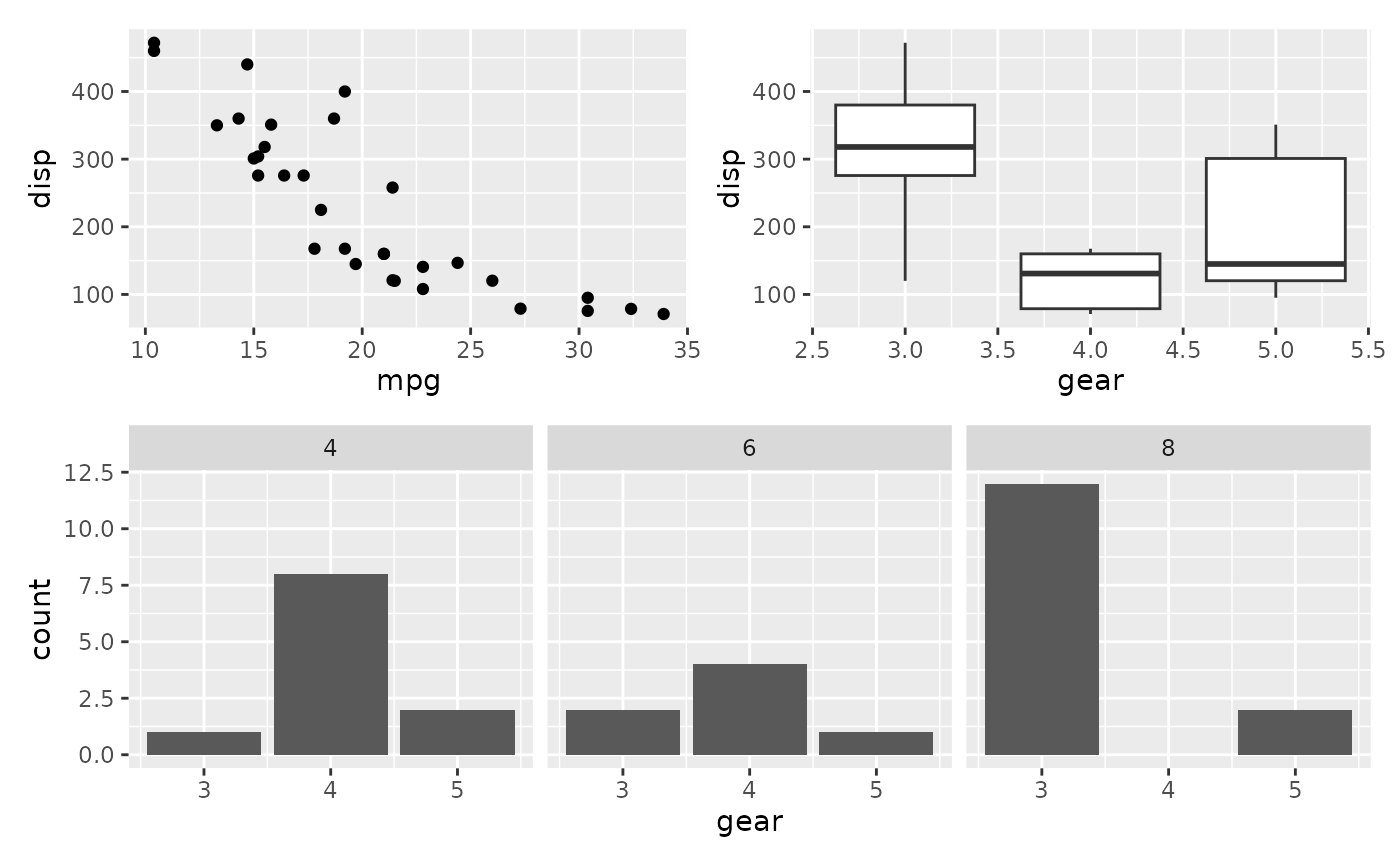 p2 <- ggplot(mtcars) + geom_boxplot(aes(gear, disp, group = gear))
