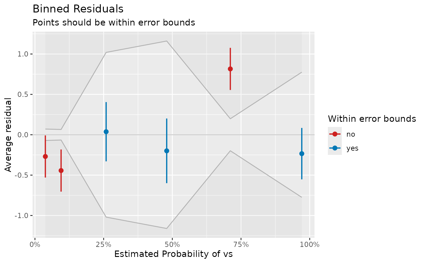 Binned residual plots are achieved by "dividing the data into categories (bins) based on their fitted values, and then plotting the average residual versus the average fitted value for each bin." (Gelman, Hill 2007: 97). If the model were true, one would expect about 95% of the residuals to fall inside the error bounds.