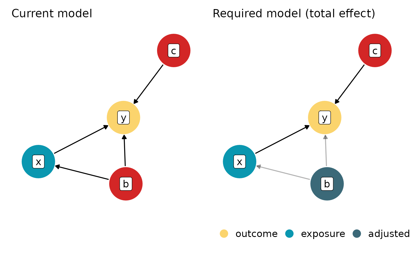 #> To estimate the direct and total effect, at least adjust for `b`. Currently, the model does not adjust for any variables.