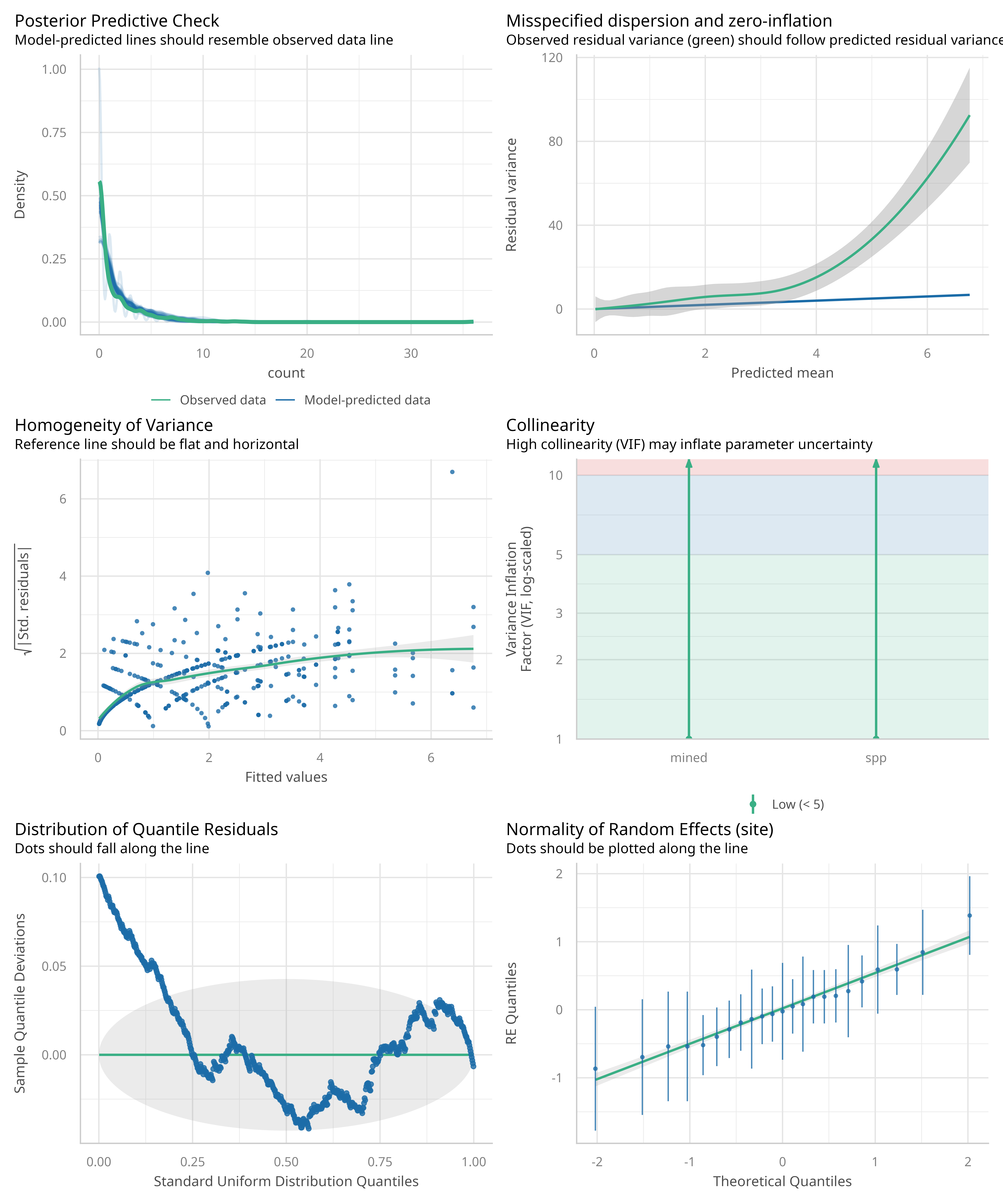 #> Model is underfitting zeros (probable zero-inflation) (p < .001).
