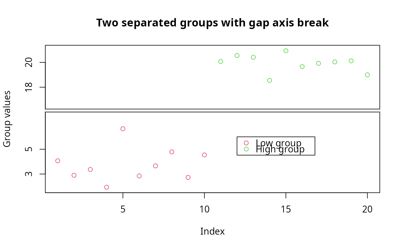 There is some controversy about the propriety of using discontinuous coordinates for plotting, and thus axis breaks. Discontinuous coordinates allow widely separated groups of values or outliers to appear without devoting too much of the plot to empty space. The major objection seems to be that the reader will be misled by assuming continuous coordinates. The gap style that clearly separates the two sections of the plot is probably best for avoiding this.