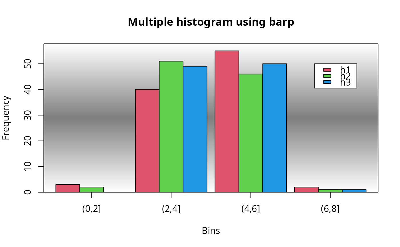 main="Multiple histogram using barp",xlab="Bins",ylab="Frequency")