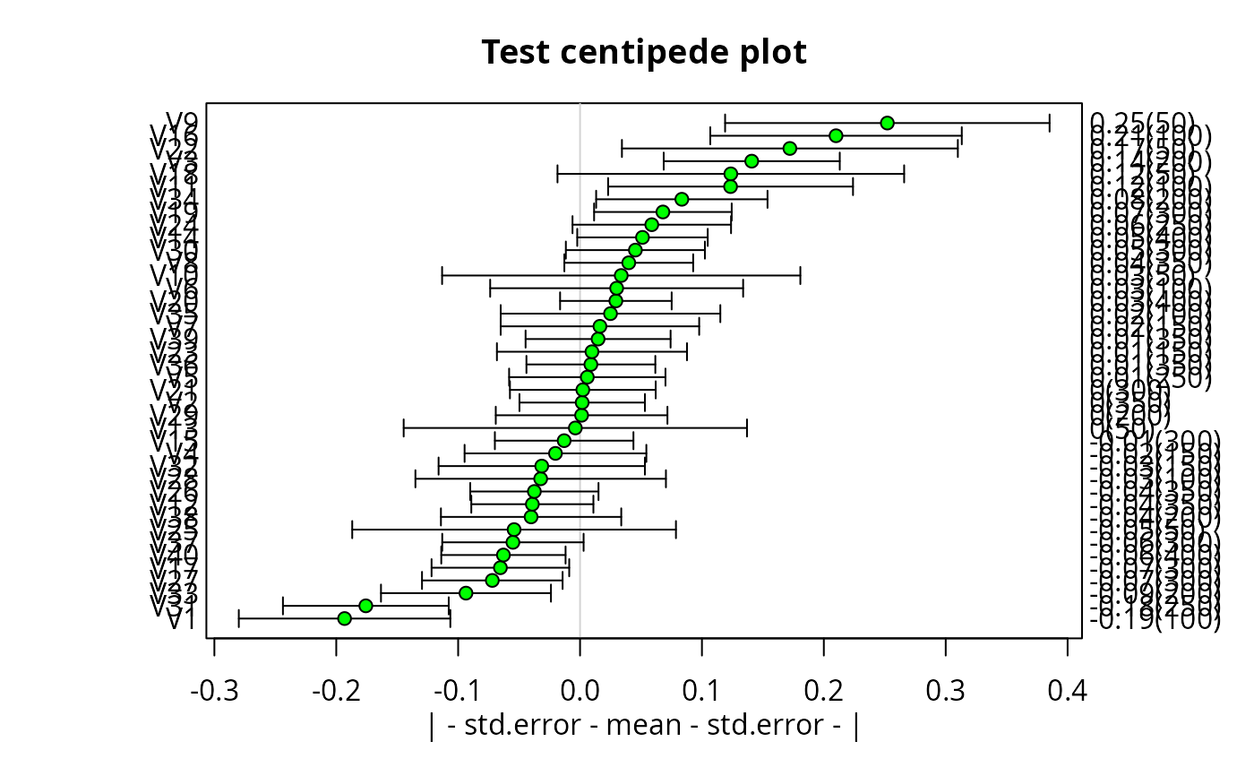 centipede.plot displays one or more midpoints and limits as filled circles with horizontal error bars. It places labels on the left and right sides of the plot. If these labels are long, it may be necessary to pass explicit values to the mar argument to leave enough room.