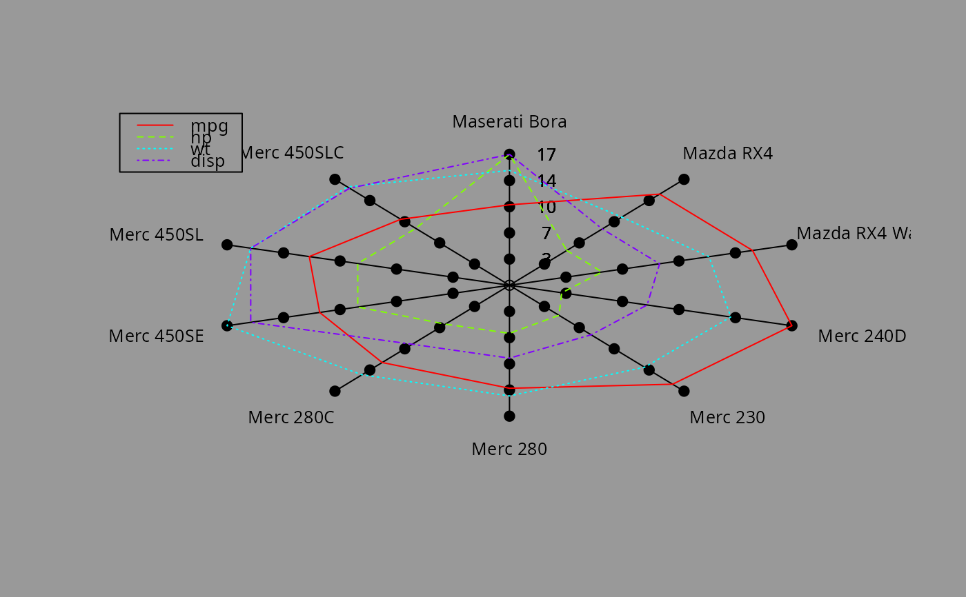 diamondplot(x, bg=gray(0.6), col=rainbow,name="", ...)
