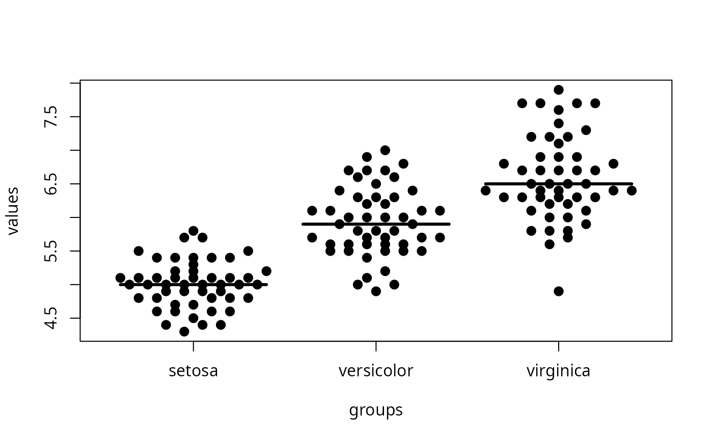 ehplot(iris$Sepal.Length, iris$Species, intervals=20, cex=1.8, pch=20)