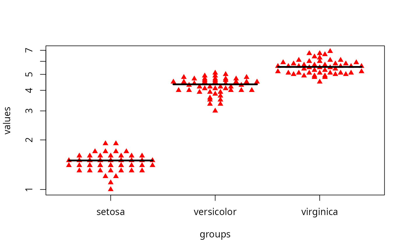 ehplot(iris$Petal.Length, iris$Species, pch=17, col="red", log=TRUE)