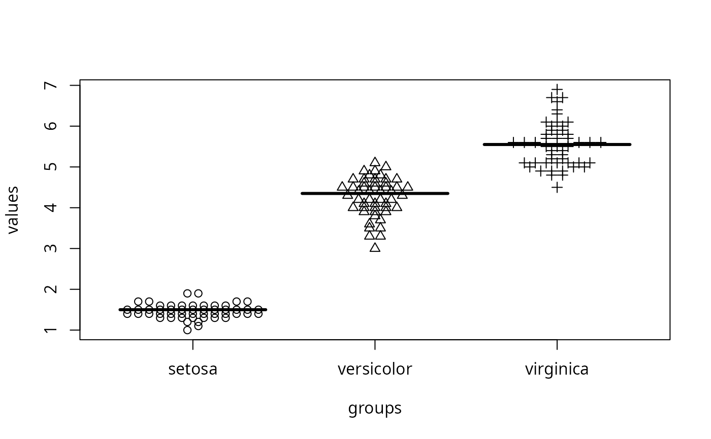 ehplot(iris$Petal.Length, iris$Species, offset=0.06, pch=as.numeric(iris$Species))