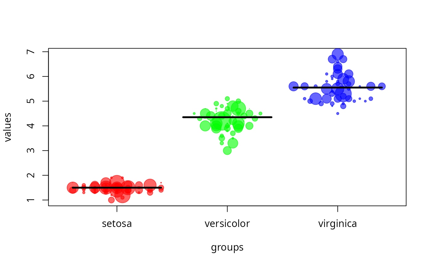 ehplot(plen, spec, pch=19, cex=pwid, col=rainbow(3, alpha=0.6)[as.numeric(spec)])