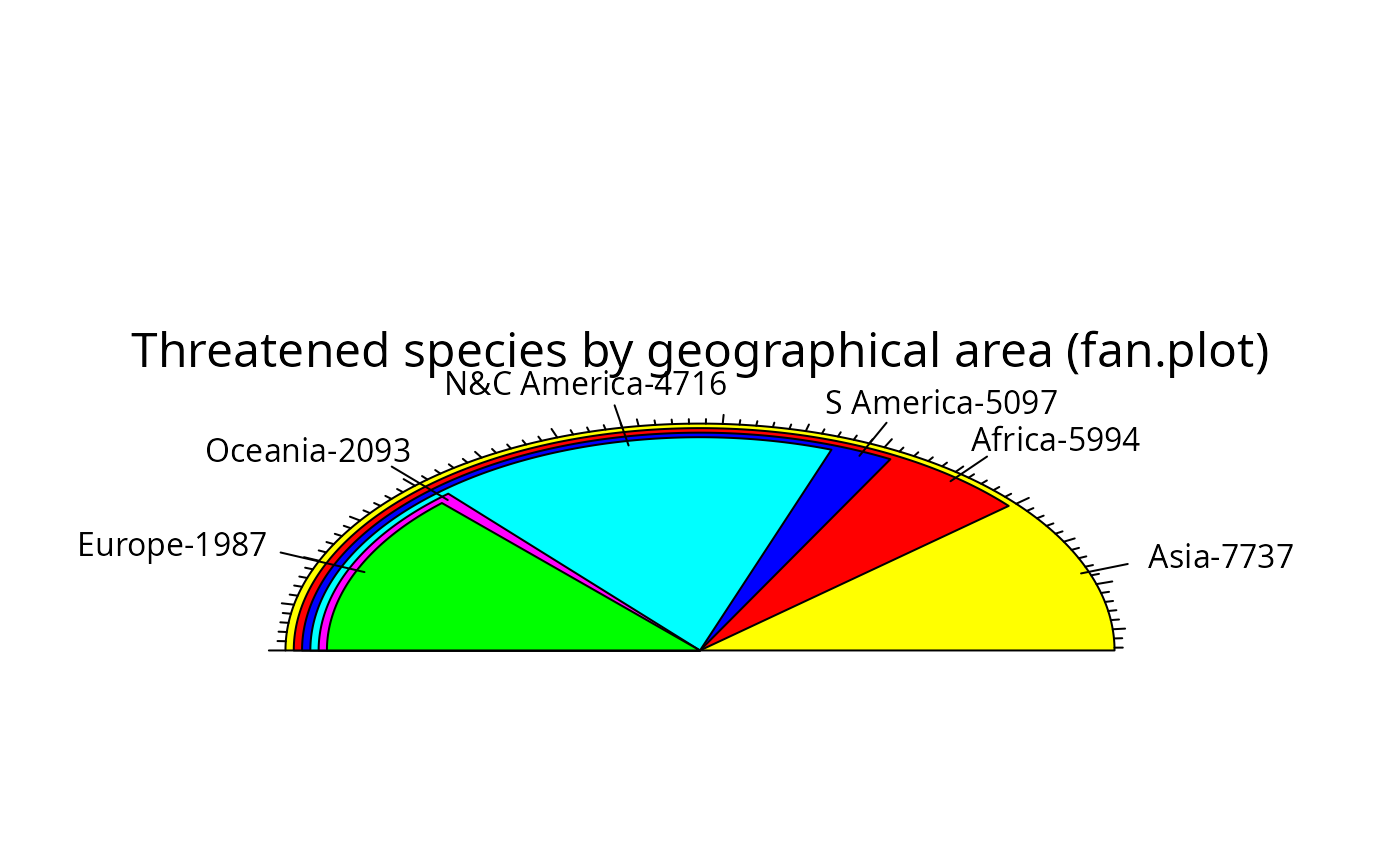 main="Threatened species by geographical area (fan.plot)",ticks=276)
