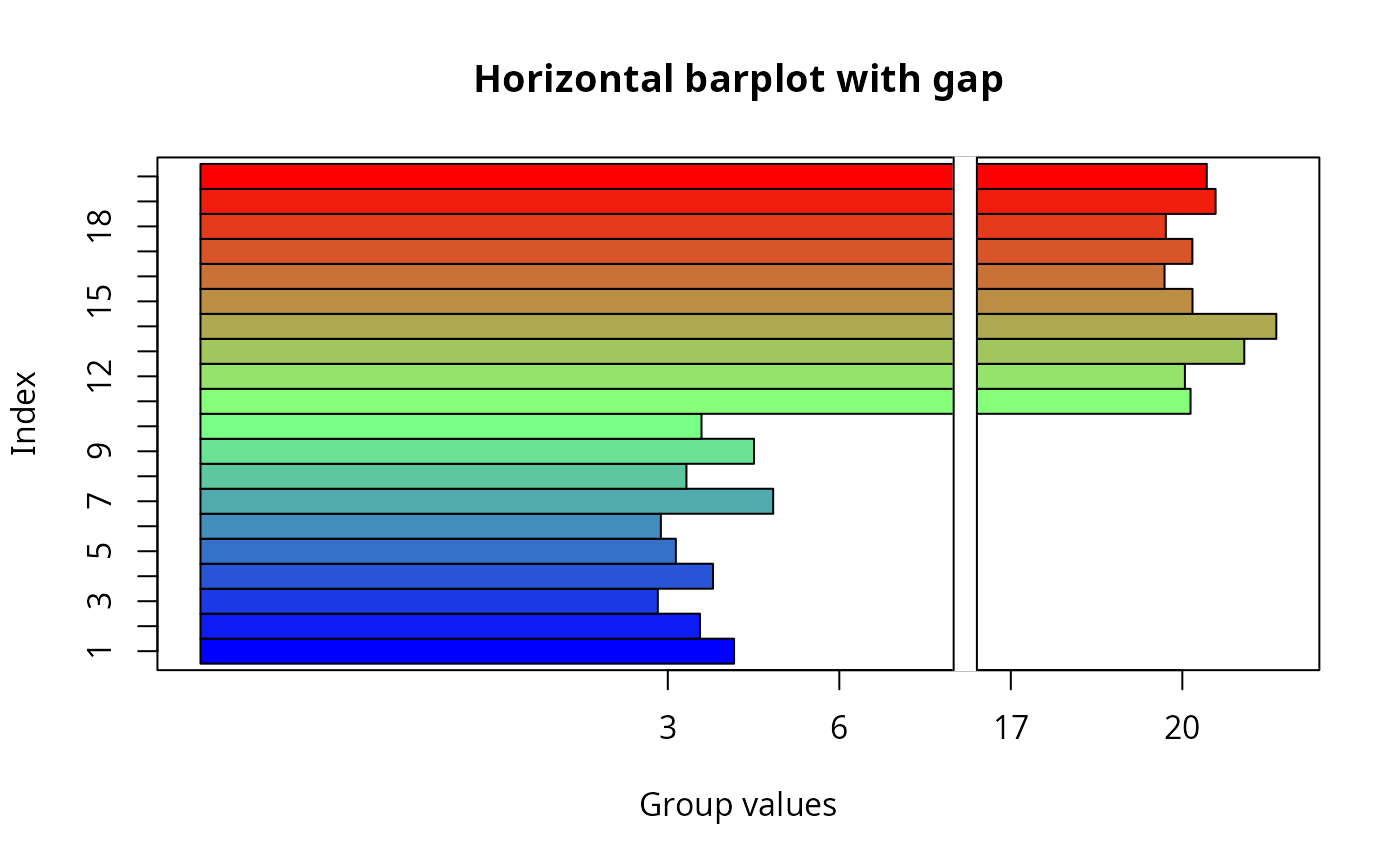 ylab="Group values",horiz=TRUE,main="Horizontal barplot with gap")