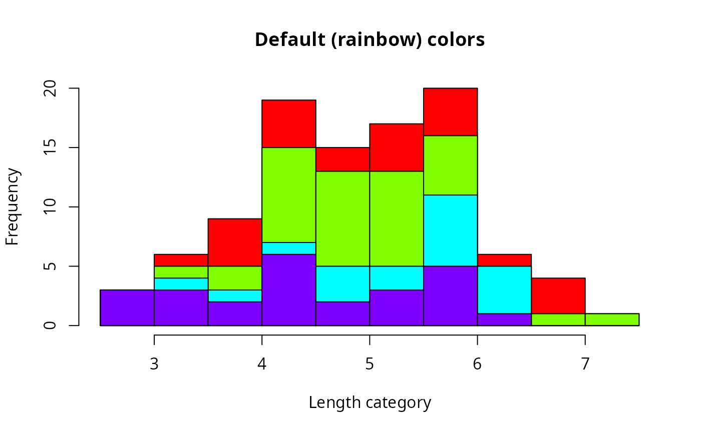 histStack(len~grp,data=df,main="Default (rainbow) colors",