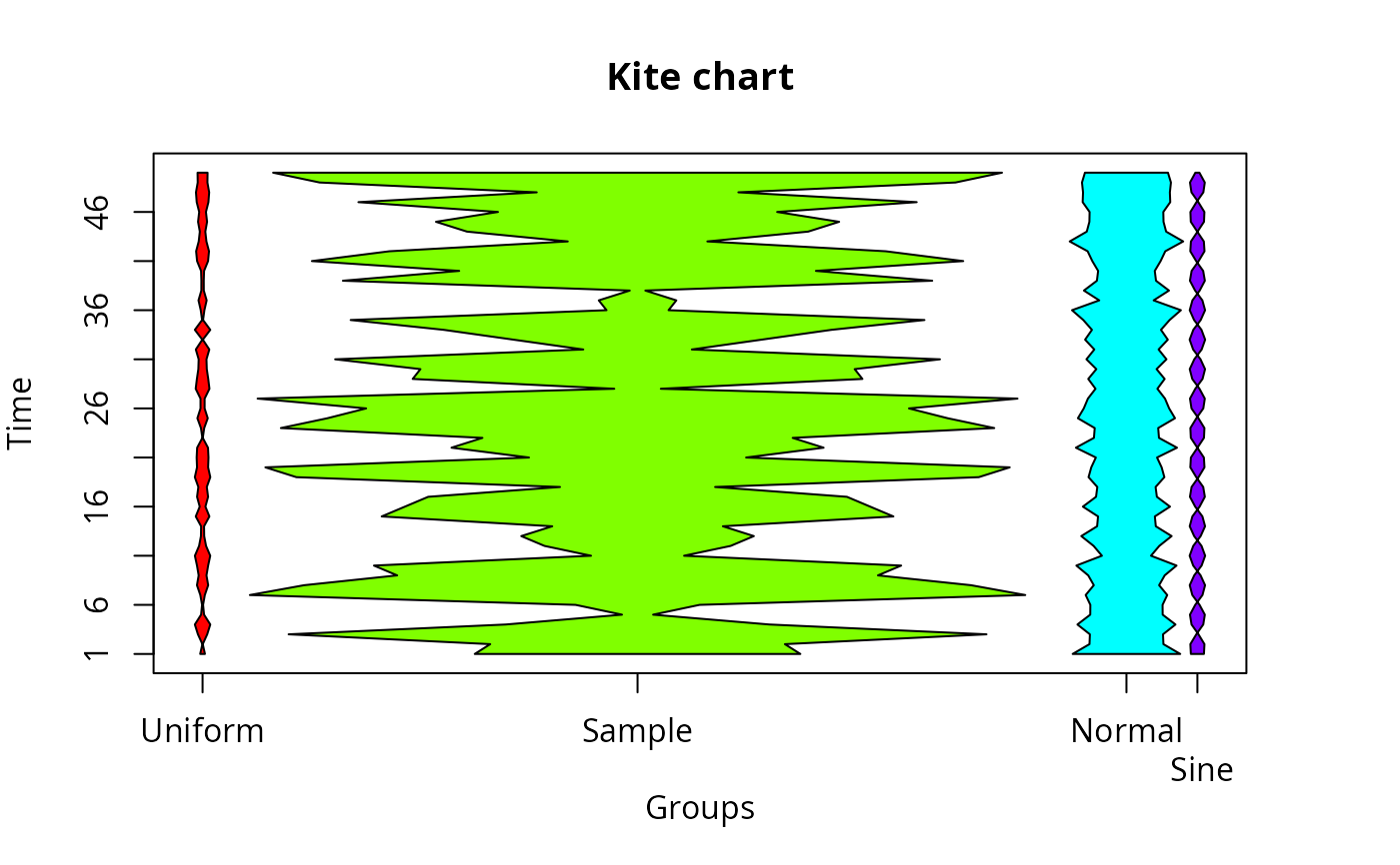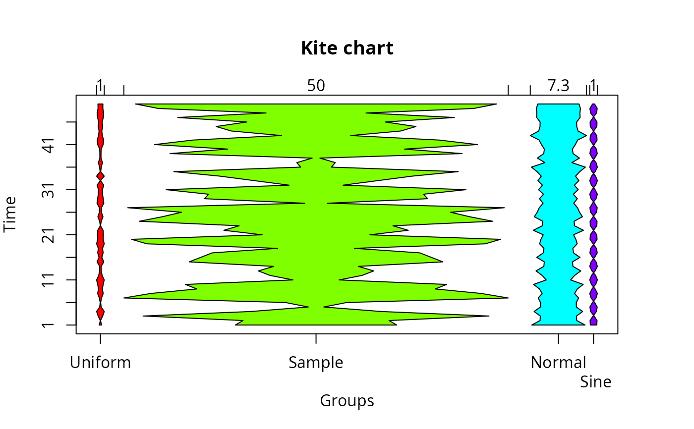 kiteChart displays each row of x as a sequence of widths, allowing the relationships between those values and the dimension along which they occur (usually time) to be illustrated.