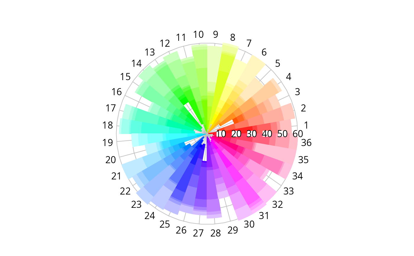 Optional colors for the sectors and annuli. Defaults to rainbow(nsectors) with fading outward if annuli are specified.