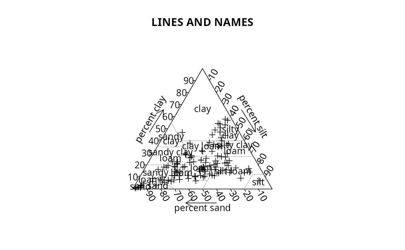 soil.texture(soils, main="LINES AND NAMES", show.lines=TRUE,