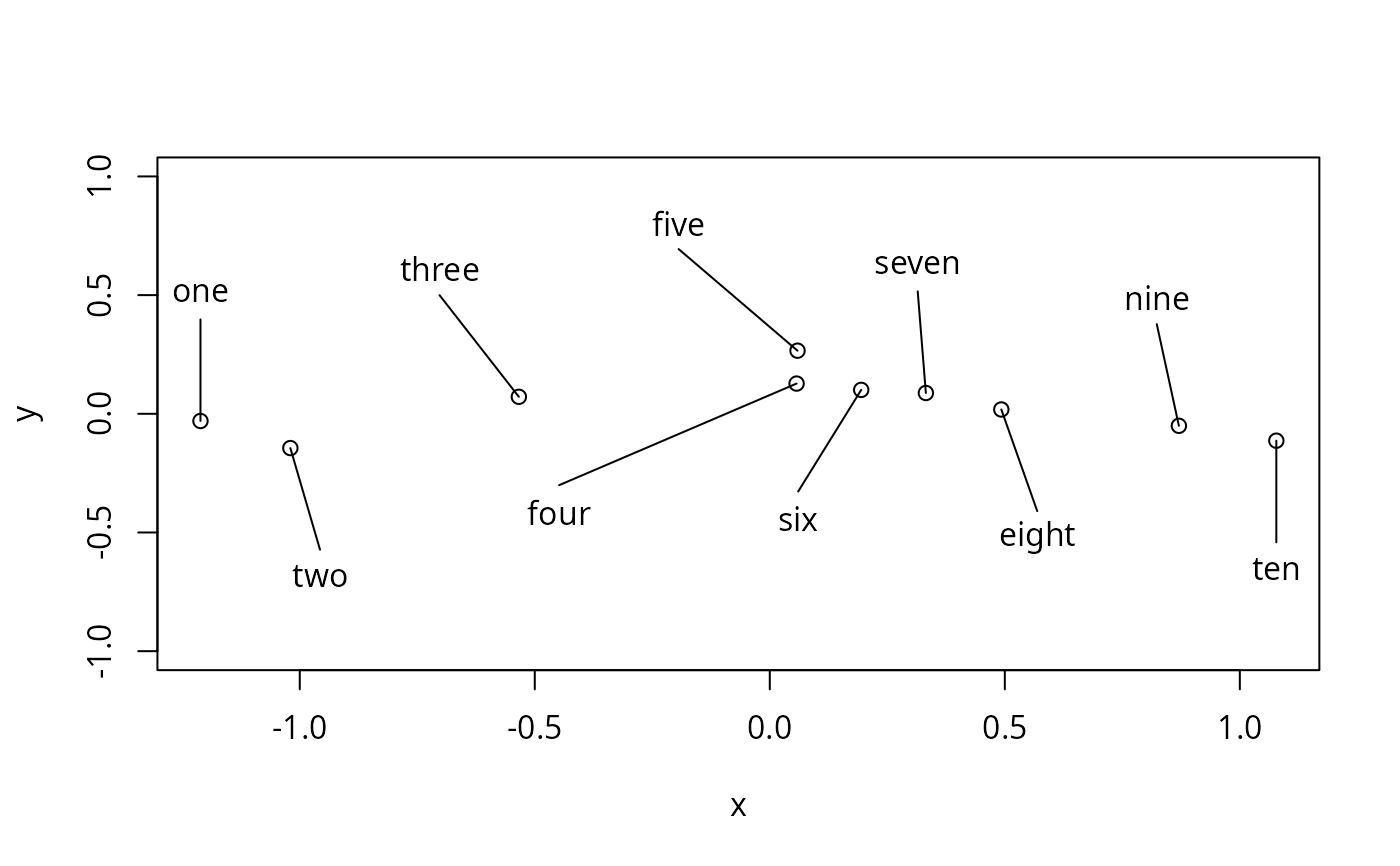 If between is TRUE, the function expects two points for each label and will attempt to place the labels between two vertical lines of points. Lines will be drawn from the ends of each label to the two corresponding points.