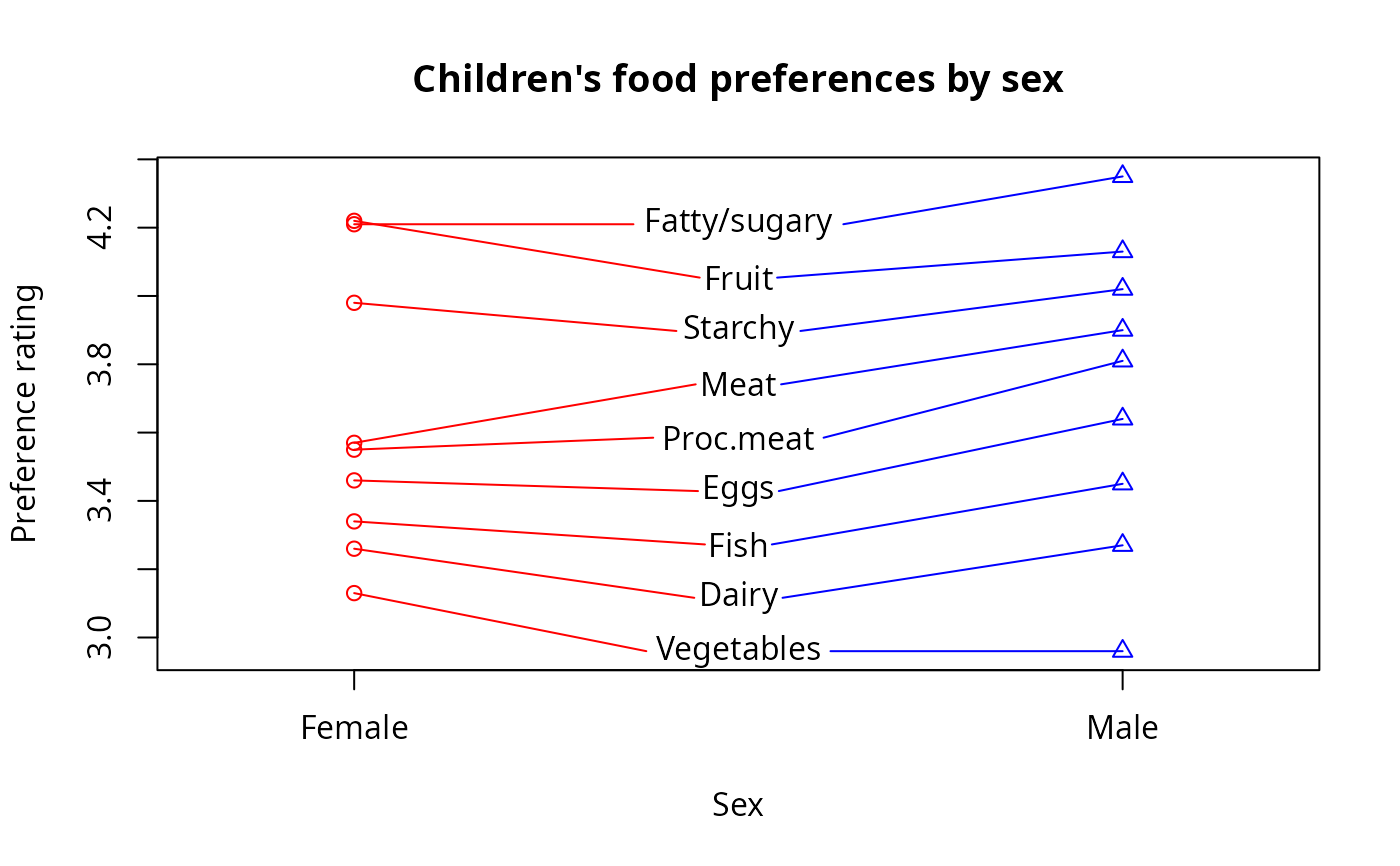 ylab="Preference rating",main="Children's food preferences by sex",