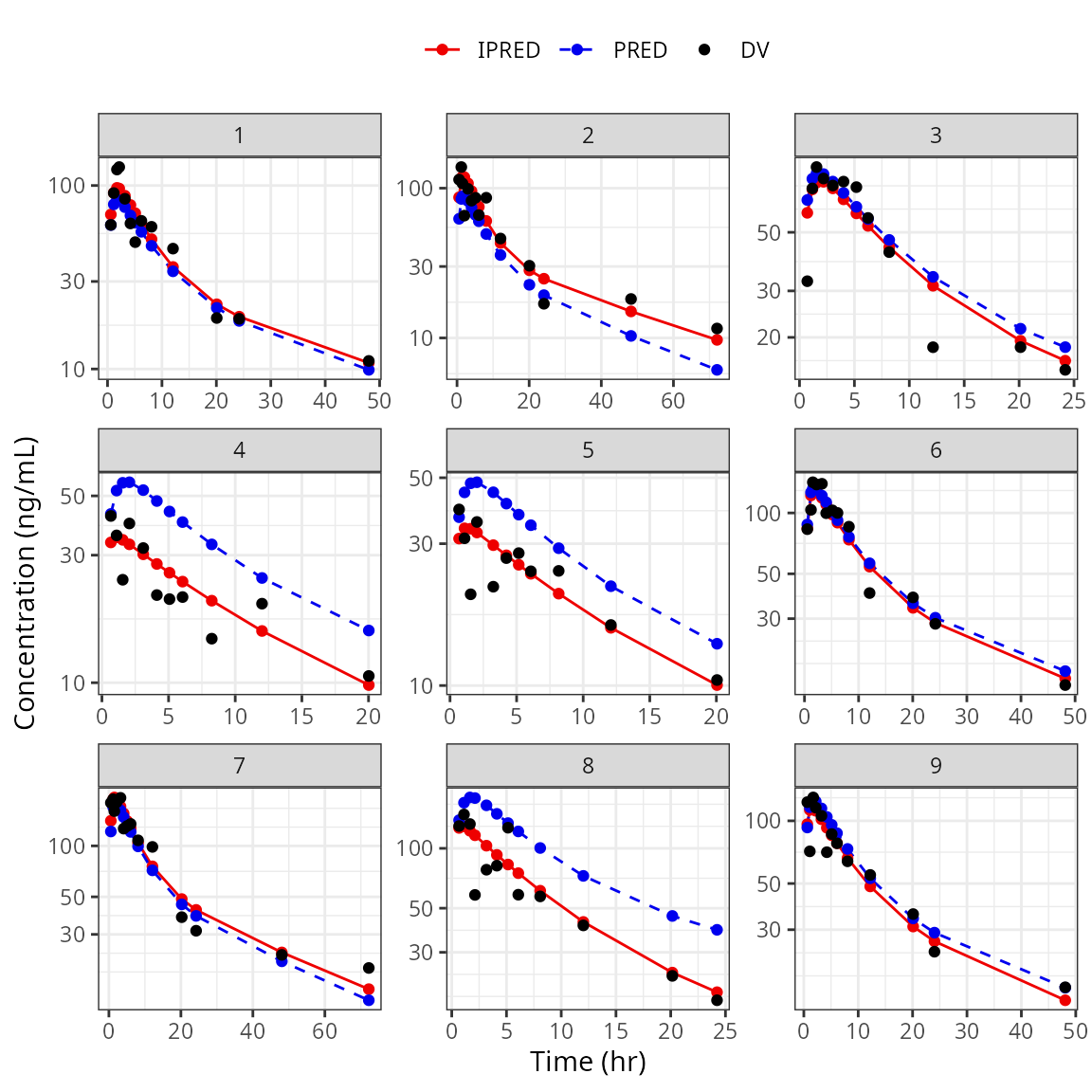dv_pred_ipred(dd1, nrow = 3, ncol = 3, ylab = "Concentration (ng/mL)", log_y=TRUE). $`1`