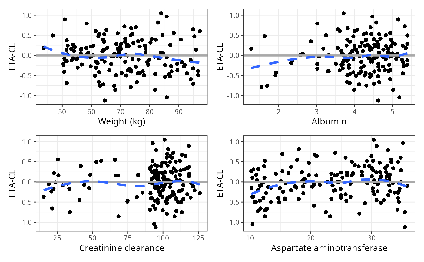eta_cont(data, x = covs, y = "ETA1//ETA-CL") %>% pm_grid()## `geom_smooth()` using formula = 'y ~ x'