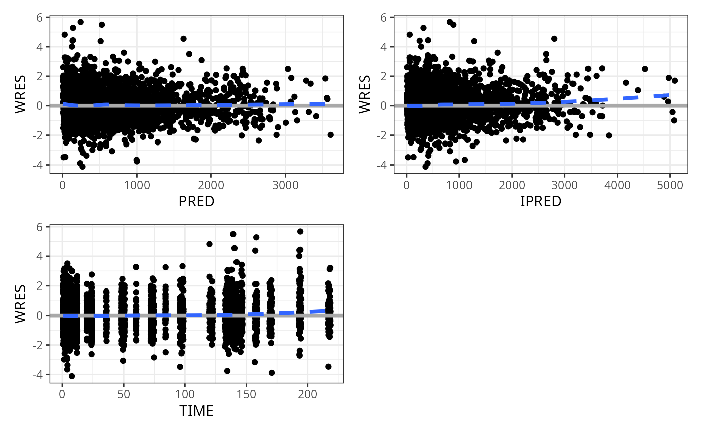 pm_scatter_list(data, y = "WRES", x = c("PRED", "IPRED", "TIME")) %>% pm_grid()