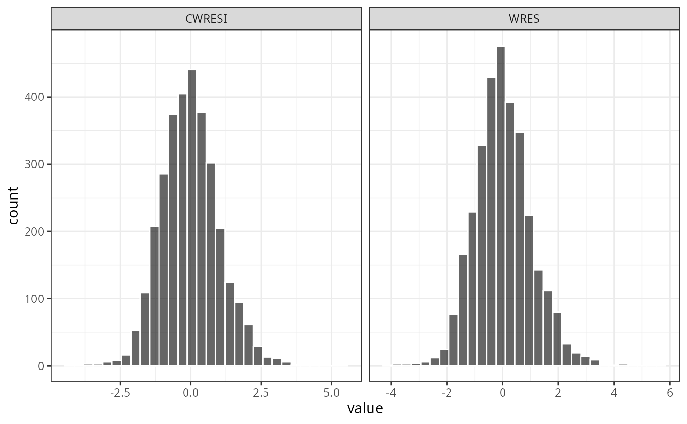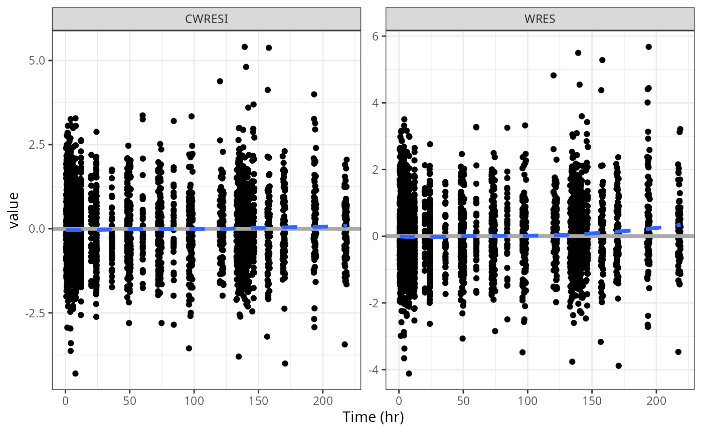 wrap_res_time(data, y = c("CWRESI", "WRES"))## `geom_smooth()` using formula = 'y ~ x'