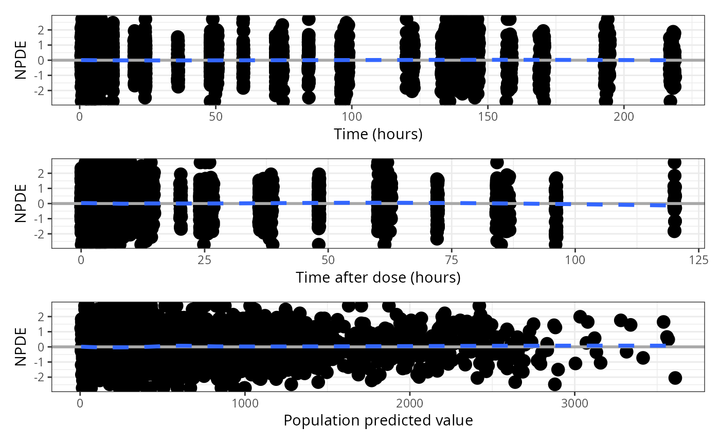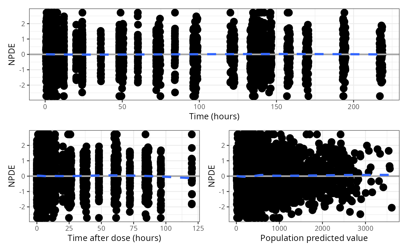 A single graphic with three panels (NPDE or CWRES versus TIME, TAD