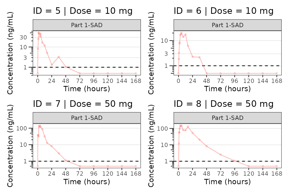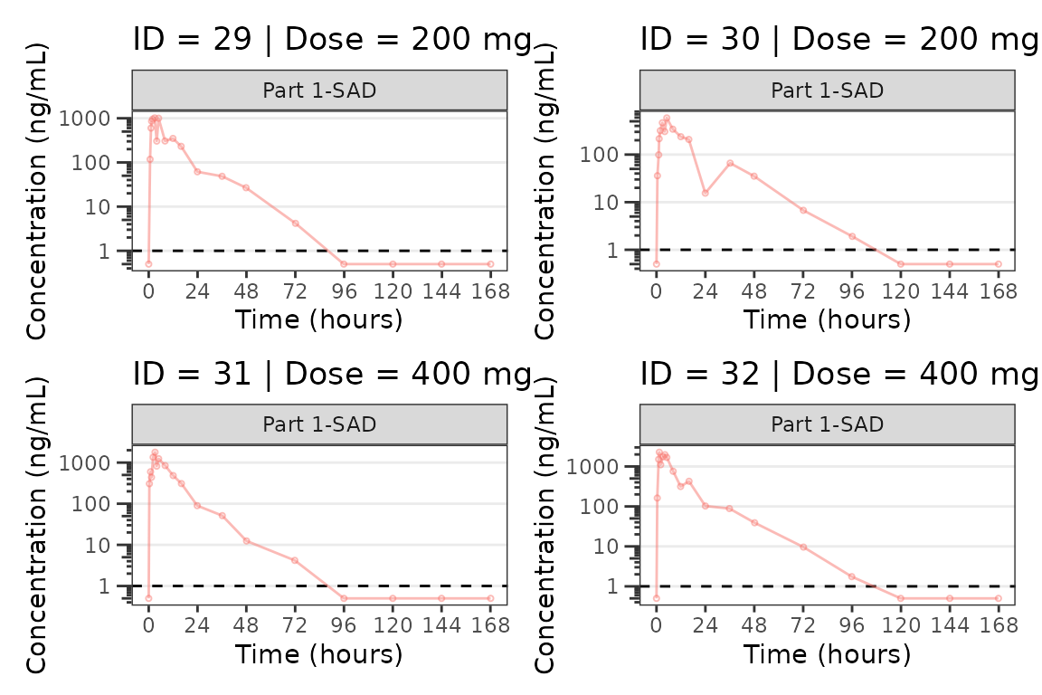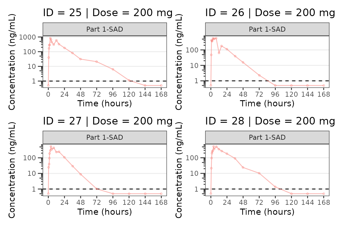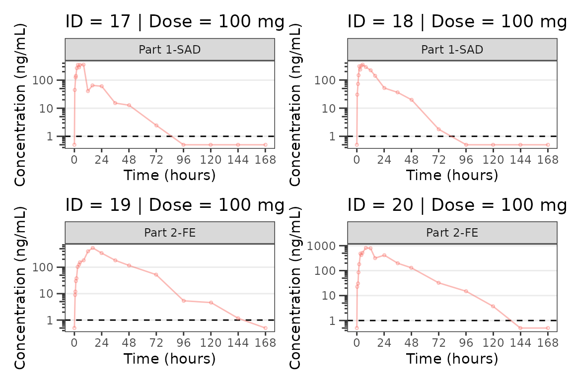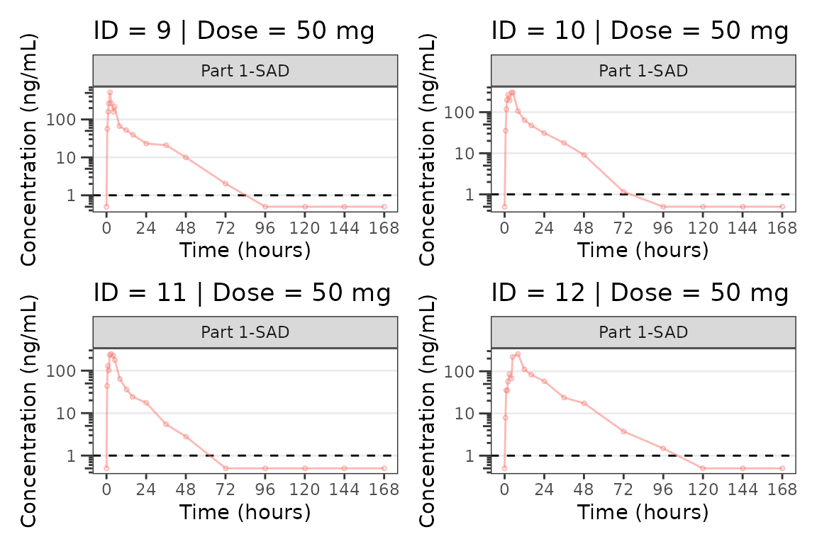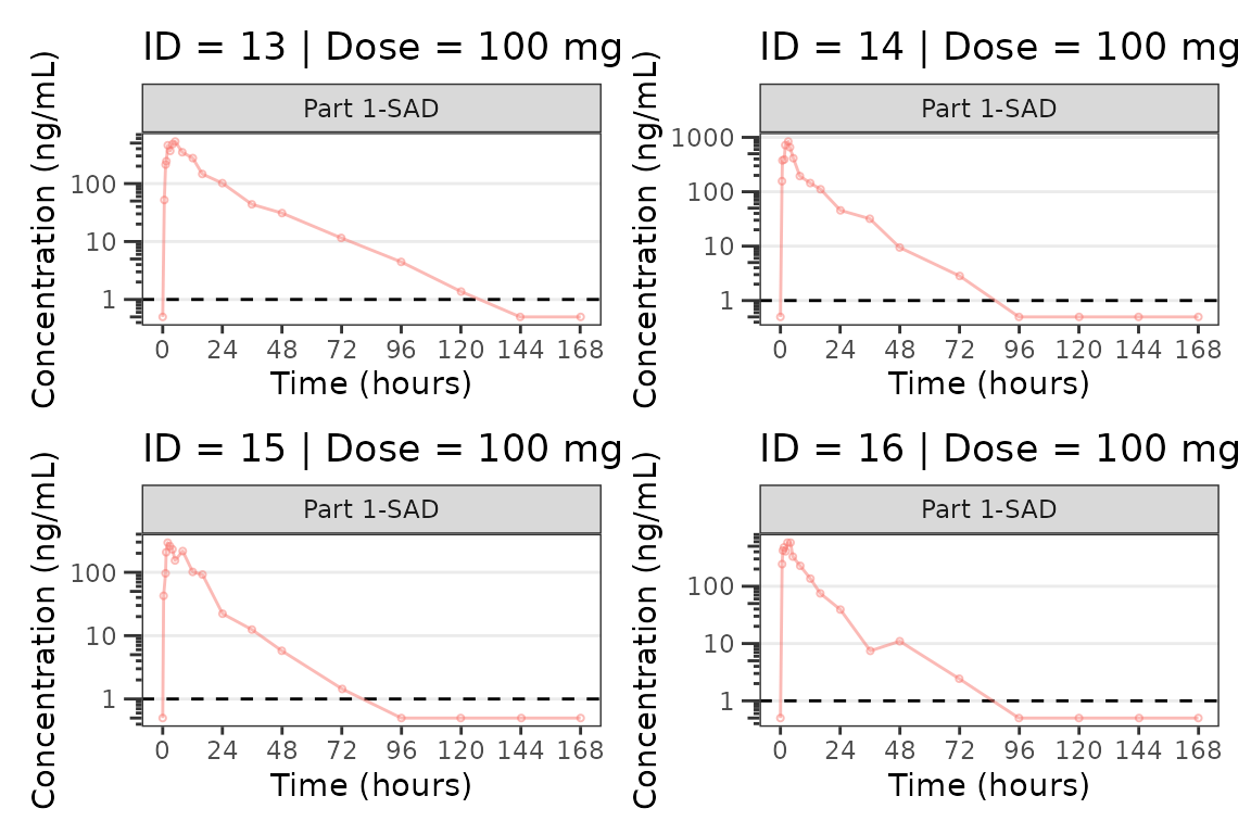 conc_obj <- PKNCAconc(filter(data_sad_nca_input, EVID==0), CONC~TIME|ID+DOSE+PART)