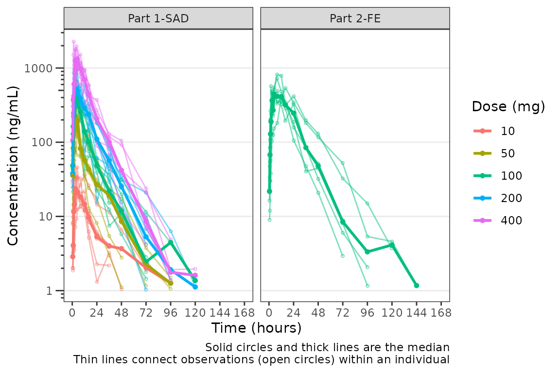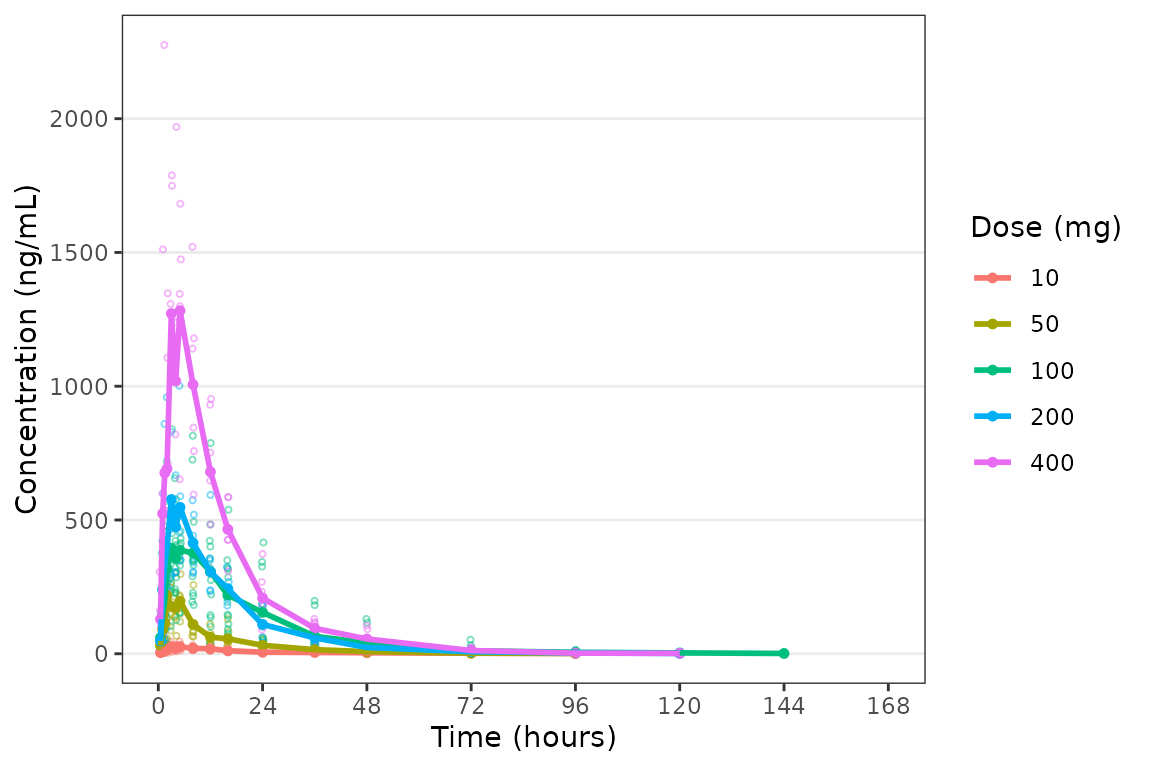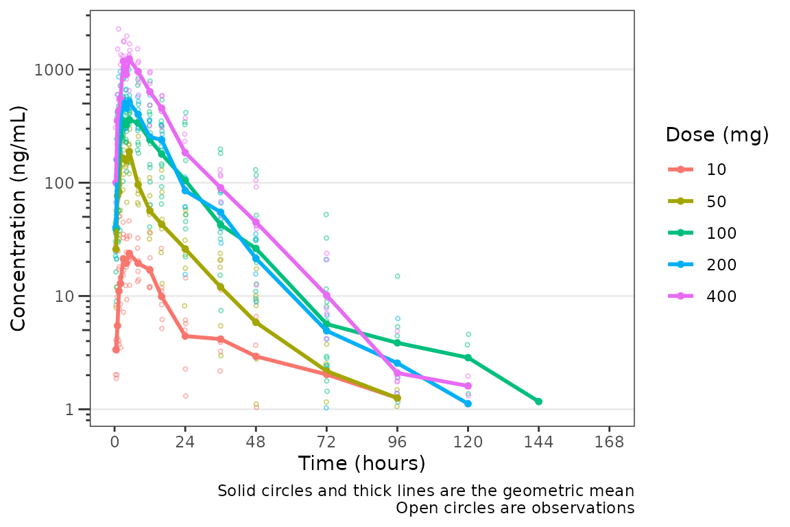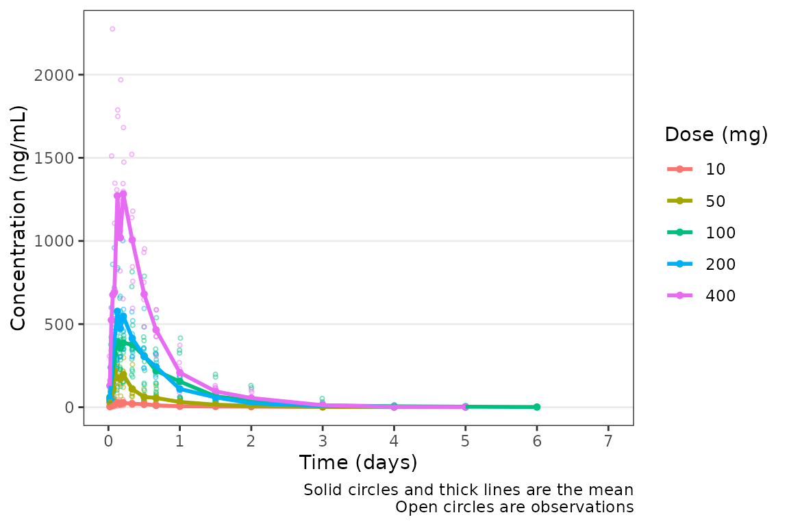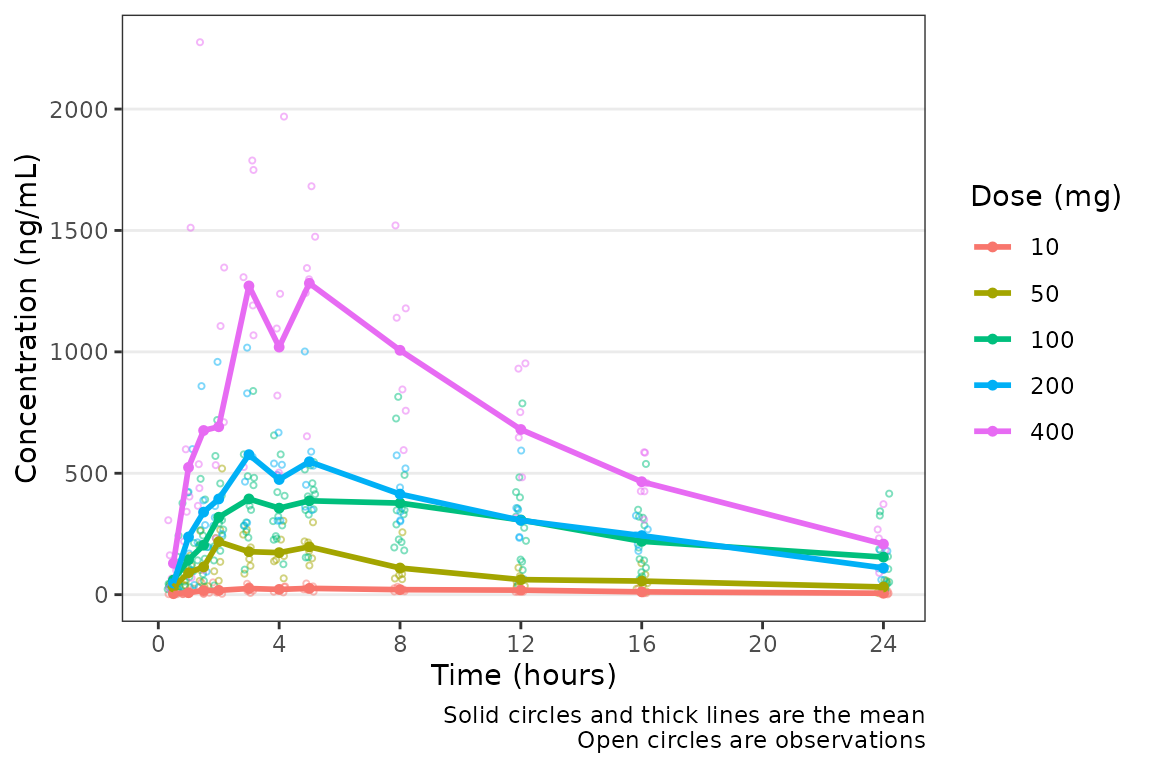 Not a bad plot with minimal arguments! We can see the mean for each dose as a colored thick line and observed data points as colored open circles with some alpha added. A caption also prints by default describing the plot elements.