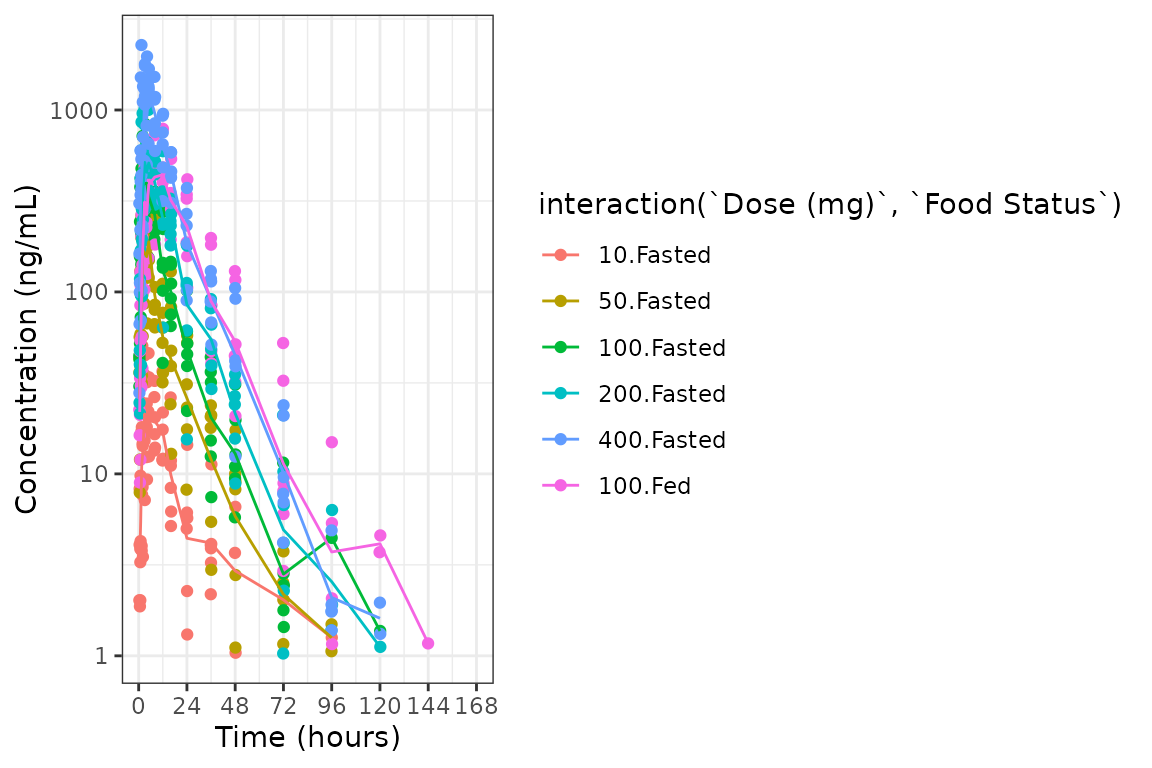 `Food Status` = factor(FOOD, levels = c(0, 1), labels = c("Fasted", "Fed")))Now let’s visualize the concentration-time data.