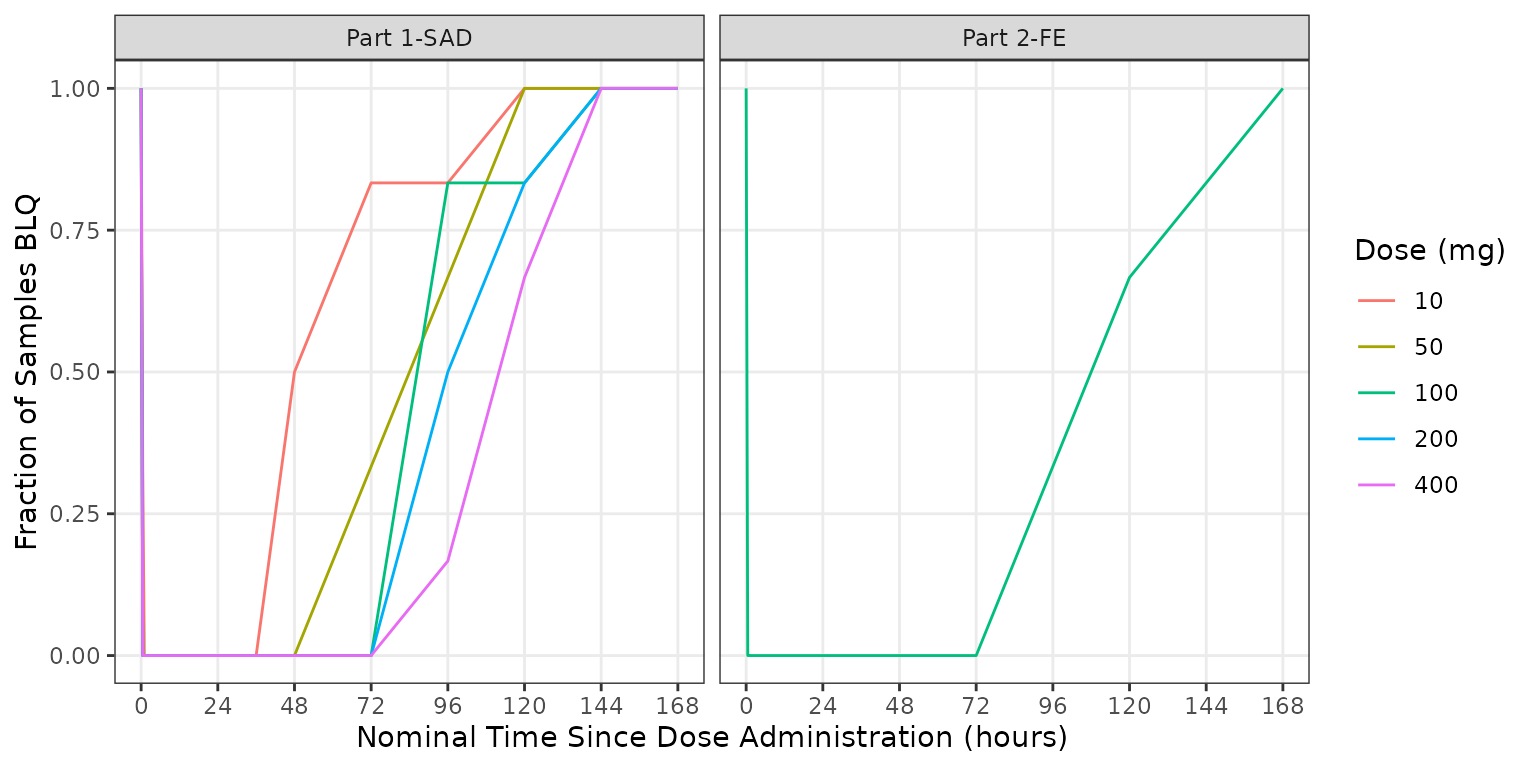 We will focus in on the 100 mg dose, which is included in both Part1-SAD and Part2-FE, and appears to display some of the most visual artifact potentially due to censoring at the LLOQ.