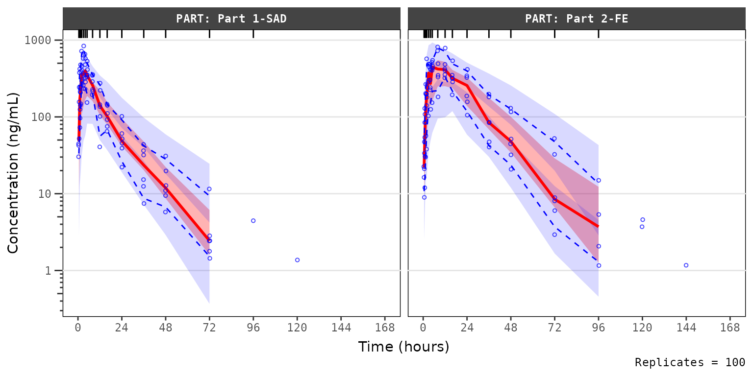 Let’s start by focusing on evaluating the model fit of the 100 mg dose level we have been exploring across Part1-SAD and Part2-FE.