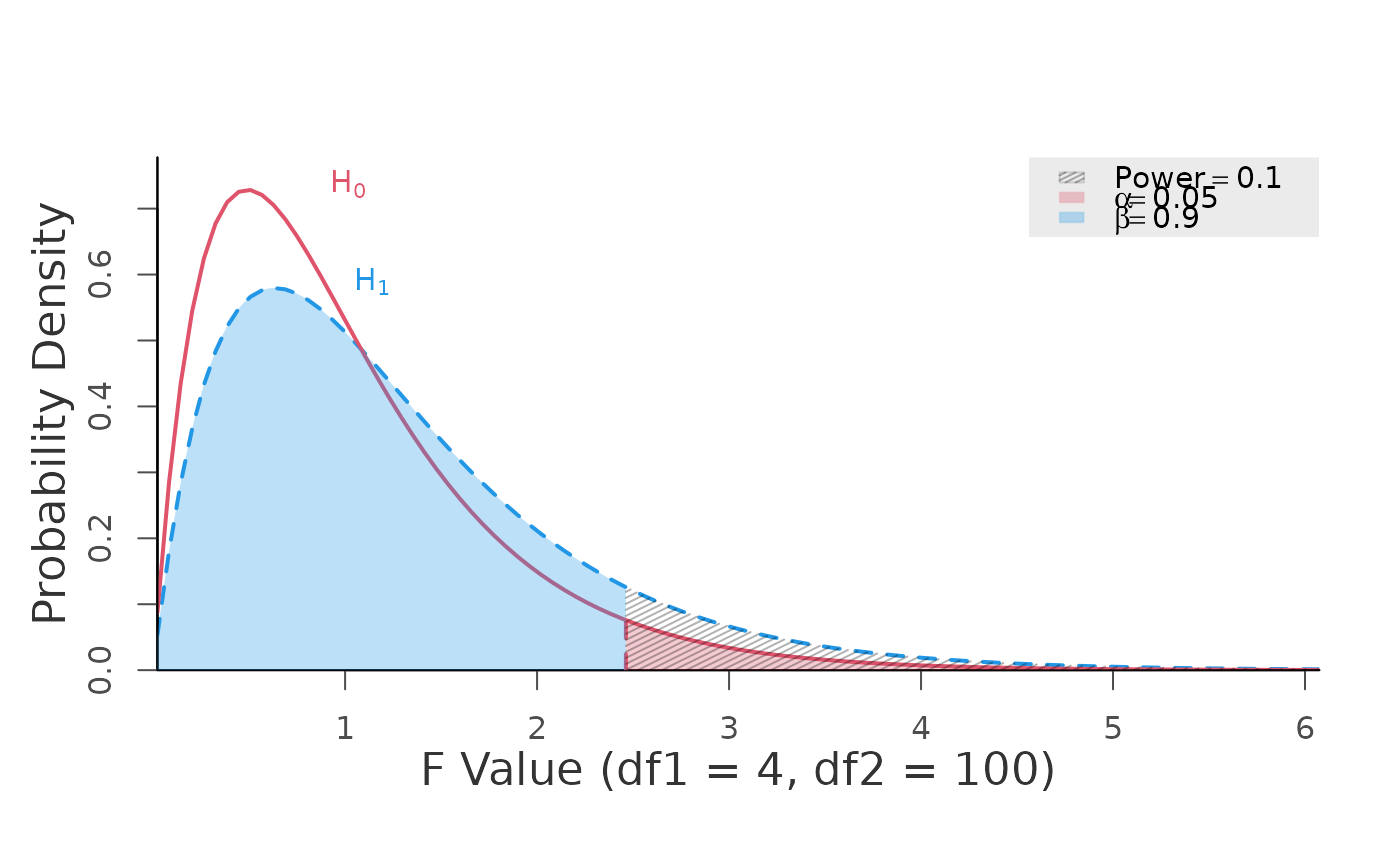power.f.test(ncp = 1, df1 = 4, df2 = 100, alpha = 0.05)