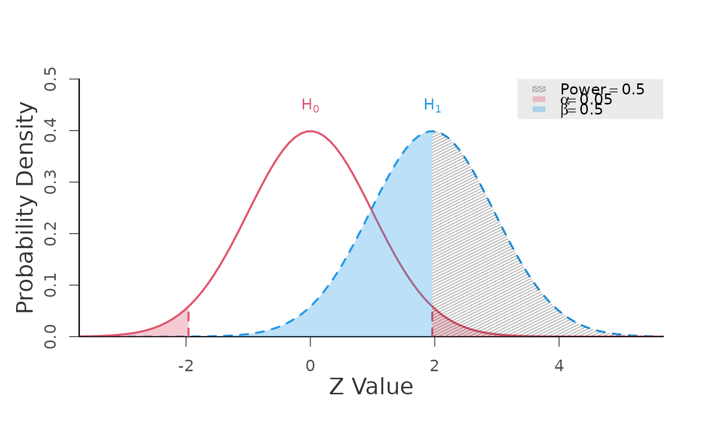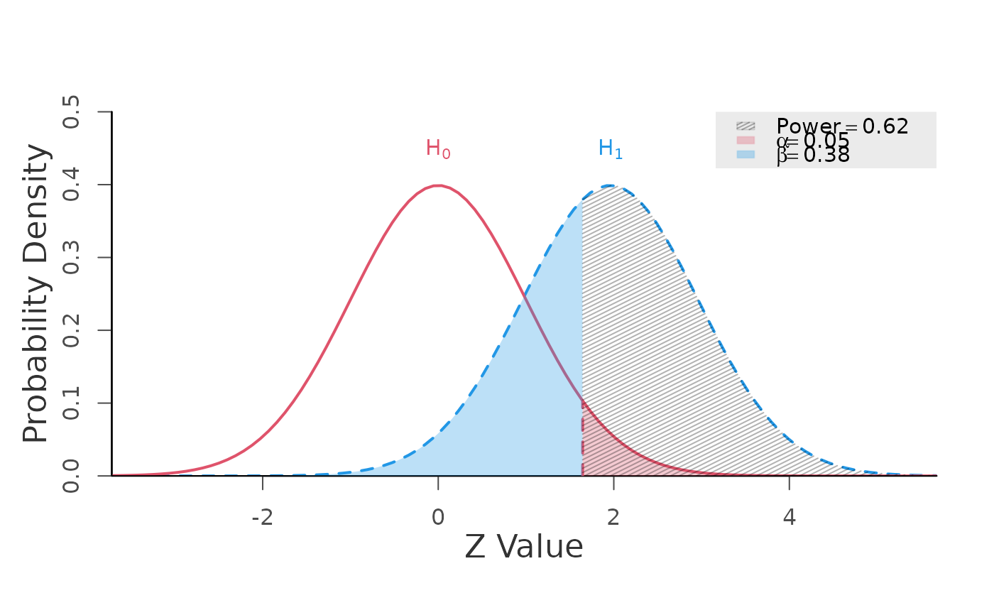 generic.z.test.RdCalculates power for the generic Z-Test with (optional) Type 1 and Type 2 error plots.