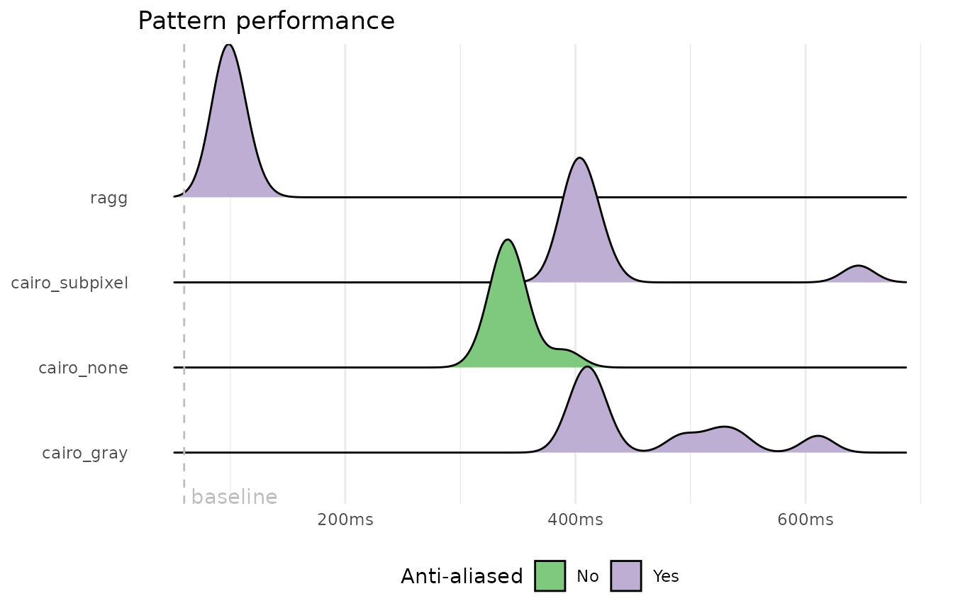 We see once again a clear performance upper-hand with ragg. The same caveats that apply to gradients are there for patterns, unfortunately, so using multiple different patterns will have considerable overhead as multiple grobs need to be created.