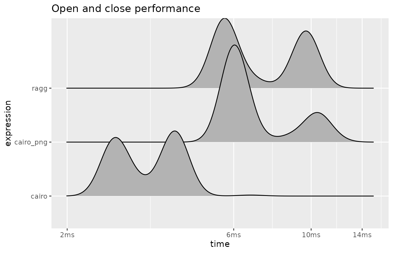All subsequent benchmarks will omit the opening and closing of the device and instead focus on rendering performance. The most important, and potentially time-consuming, part of opening and closing a device is allocation of a buffer to write raster information to, and serialising the buffer into a file. It is also where performance differences between e.g. png and tiff will come from. As both ragg and grDevices use the same underlying libraries to write to png files (libpng) it is not expected that there is much difference.