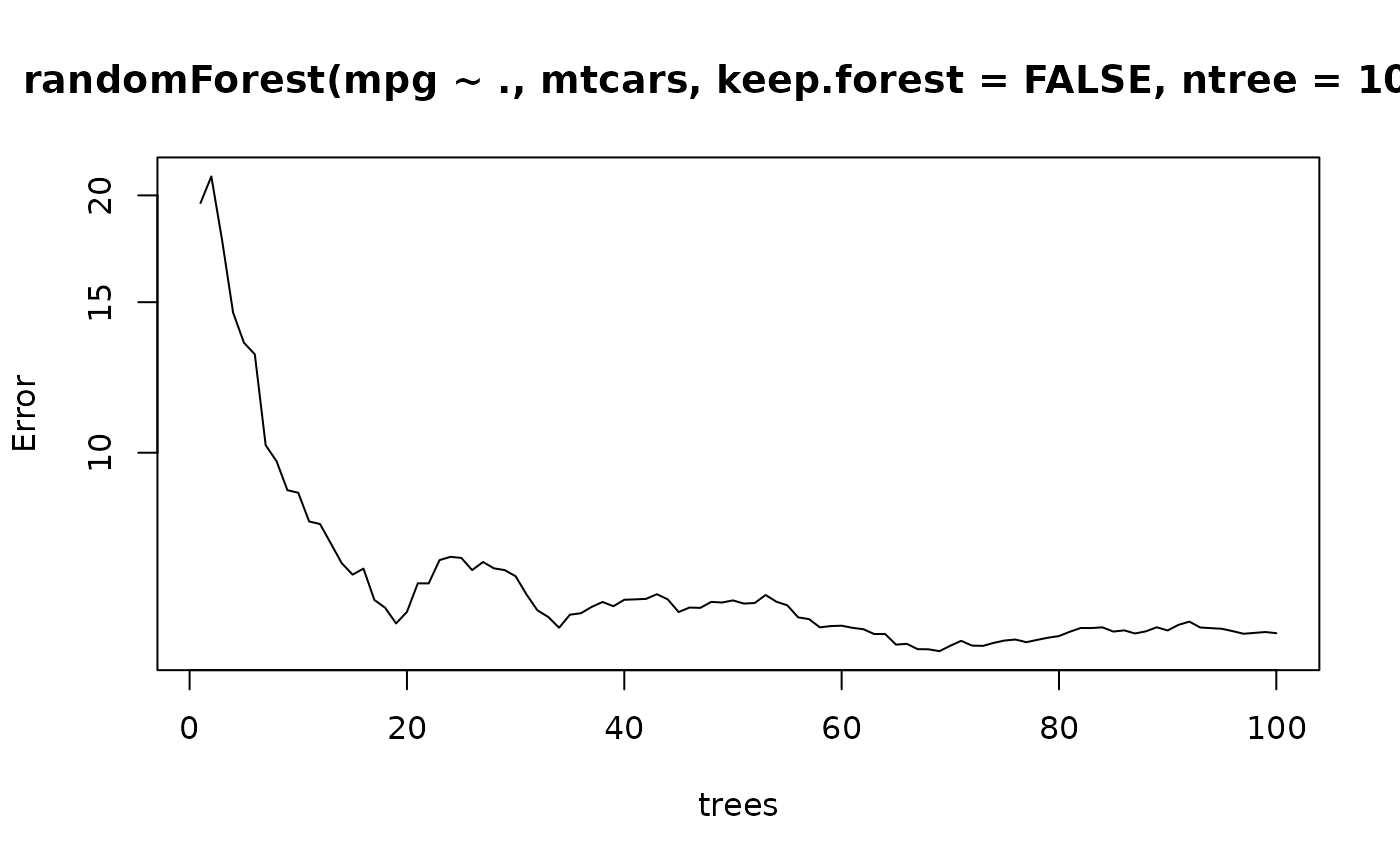 plot(randomForest(mpg ~ ., mtcars, keep.forest=FALSE, ntree=100), log="y")