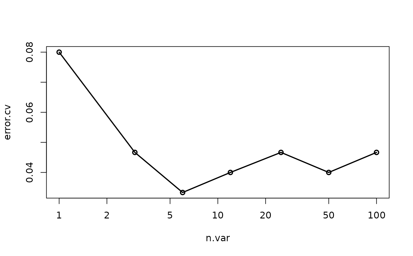 list(n.var=n.var, error.cv=error.cv, predicted=cv.pred)