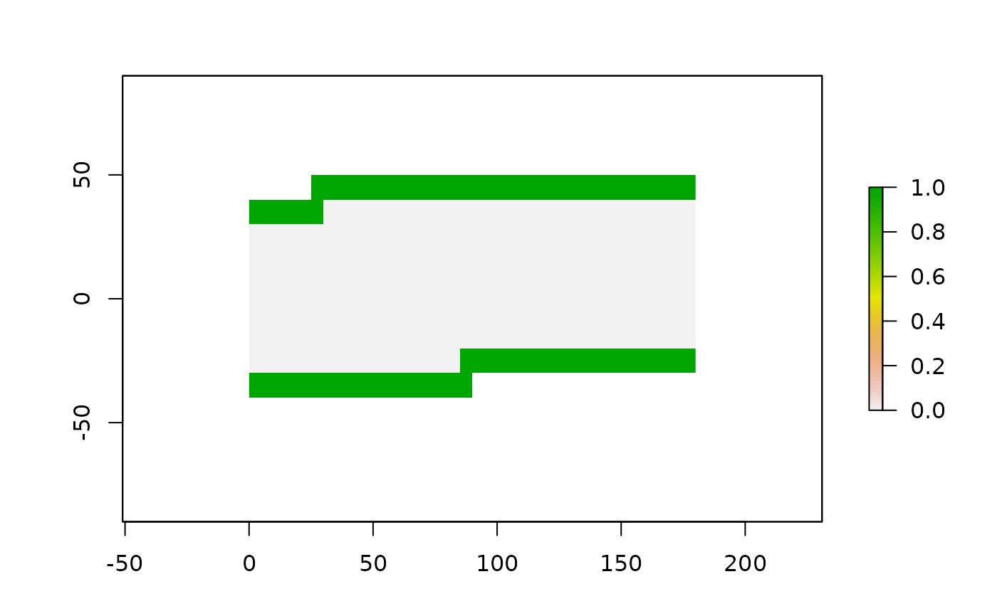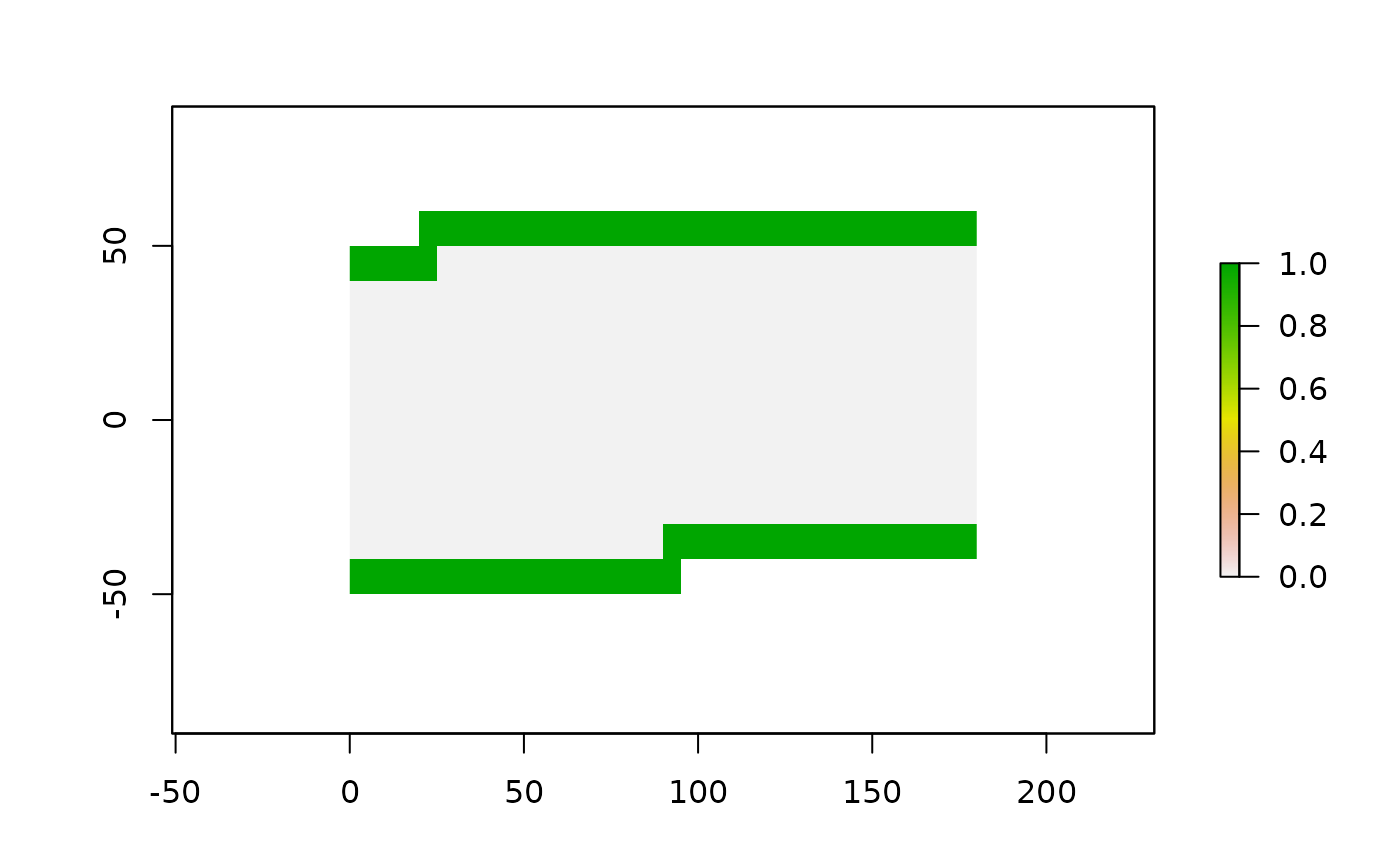 RasterLayer. Cell values are either 1 (a border) or 0 (not a border), or NA
