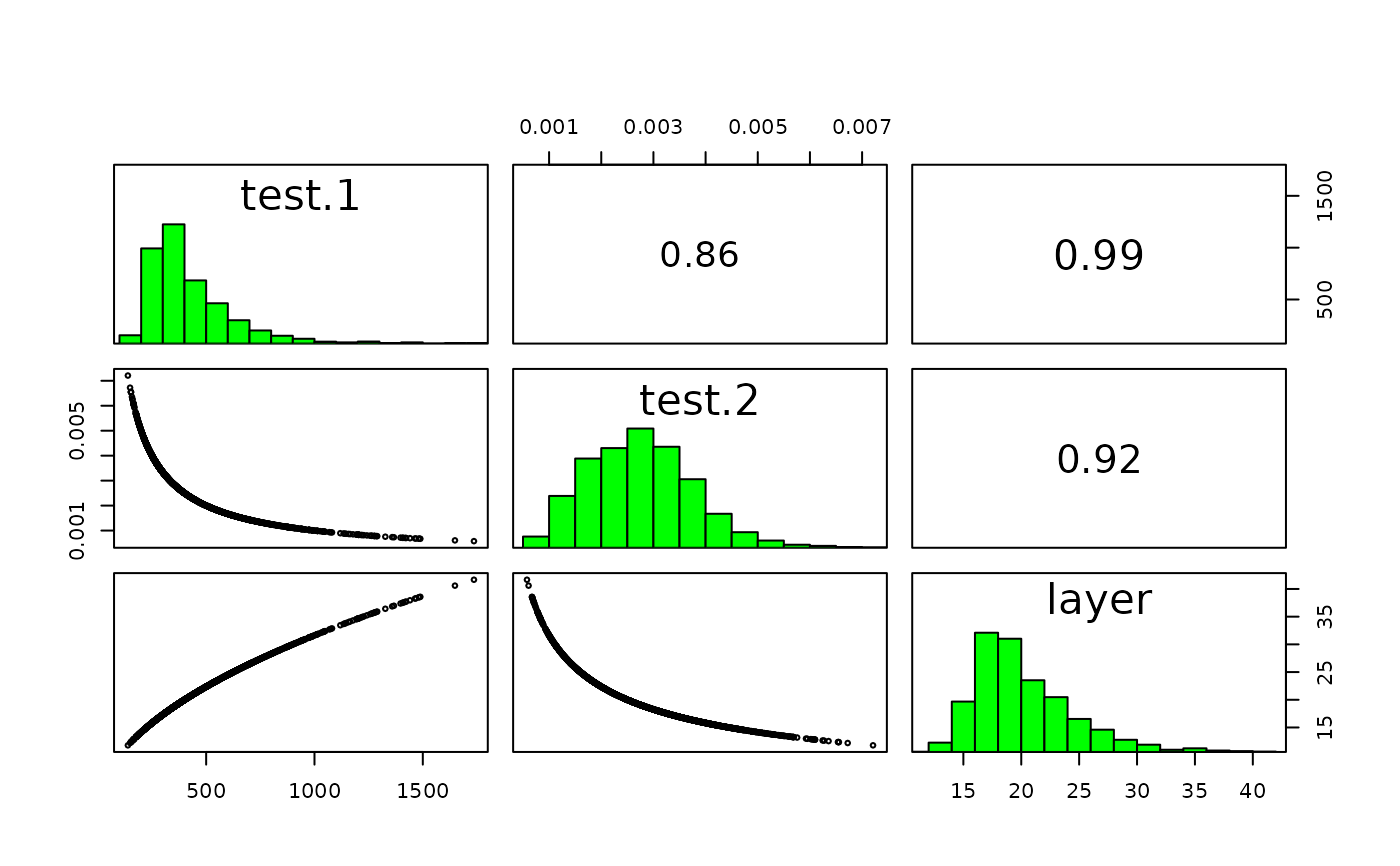 pairs(x, hist=TRUE, cor=TRUE, use="pairwise.complete.obs", maxpixels=100000, ...)RasterBrick or RasterStack
