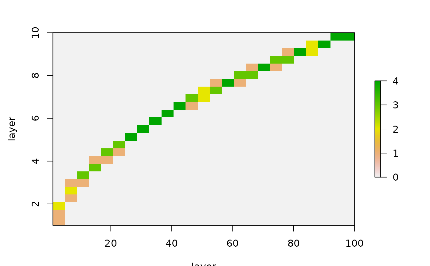 plot(r, breaks=brks, col=cols, lab.breaks=brks, zlim=c(0,1), main='first')