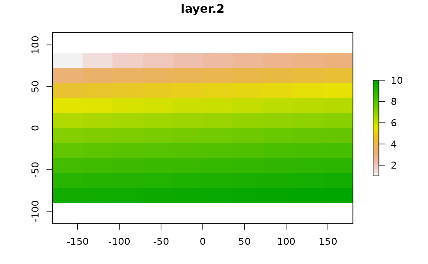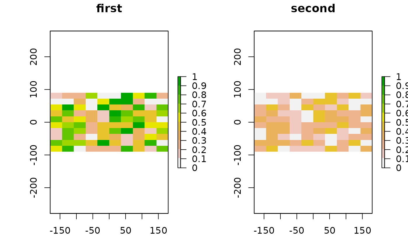 plot(r2, breaks=brks, col=cols, lab.breaks=brks, zlim=c(0,1), main='second')