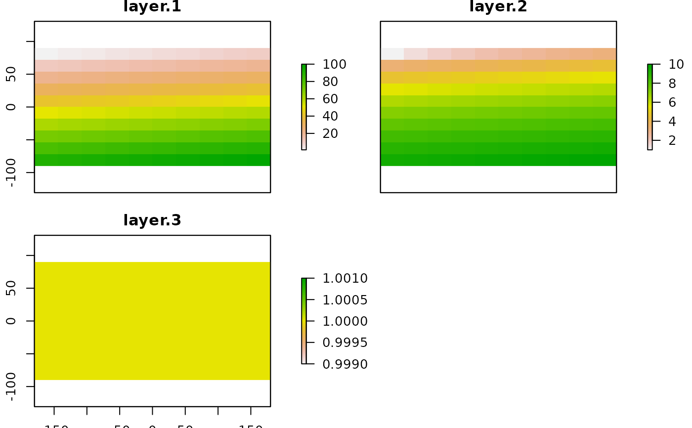 plot.RdPlot (that is, make a map of) the values of a Raster* object, or make a scatterplot of their values.