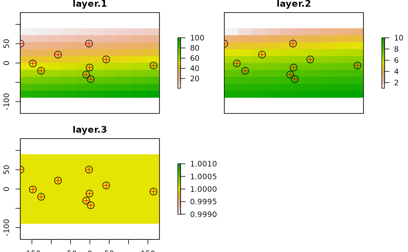 If x is a RasterStack or RasterBrick: integer, character (layer name(s)), or missing to select which layer(s) to plot. If missing, all RasterLayers in the RasterStack will be plotted (up to a maximum of 16). Or another Raster* object of the same extent and resolution, to produce a scatter plot of the cell values.