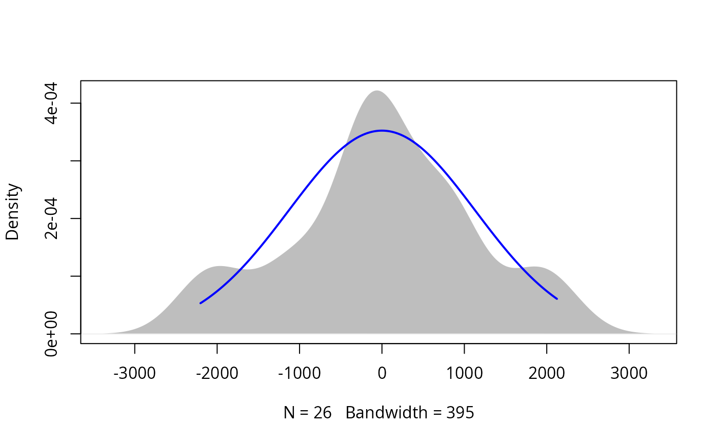 plotNormalDensity.RdProduces a density plot for a vector of values and adds a normal curve with the same mean and standard deviation. The plot can be used to quickly compare the distribution of data to a normal distribution.