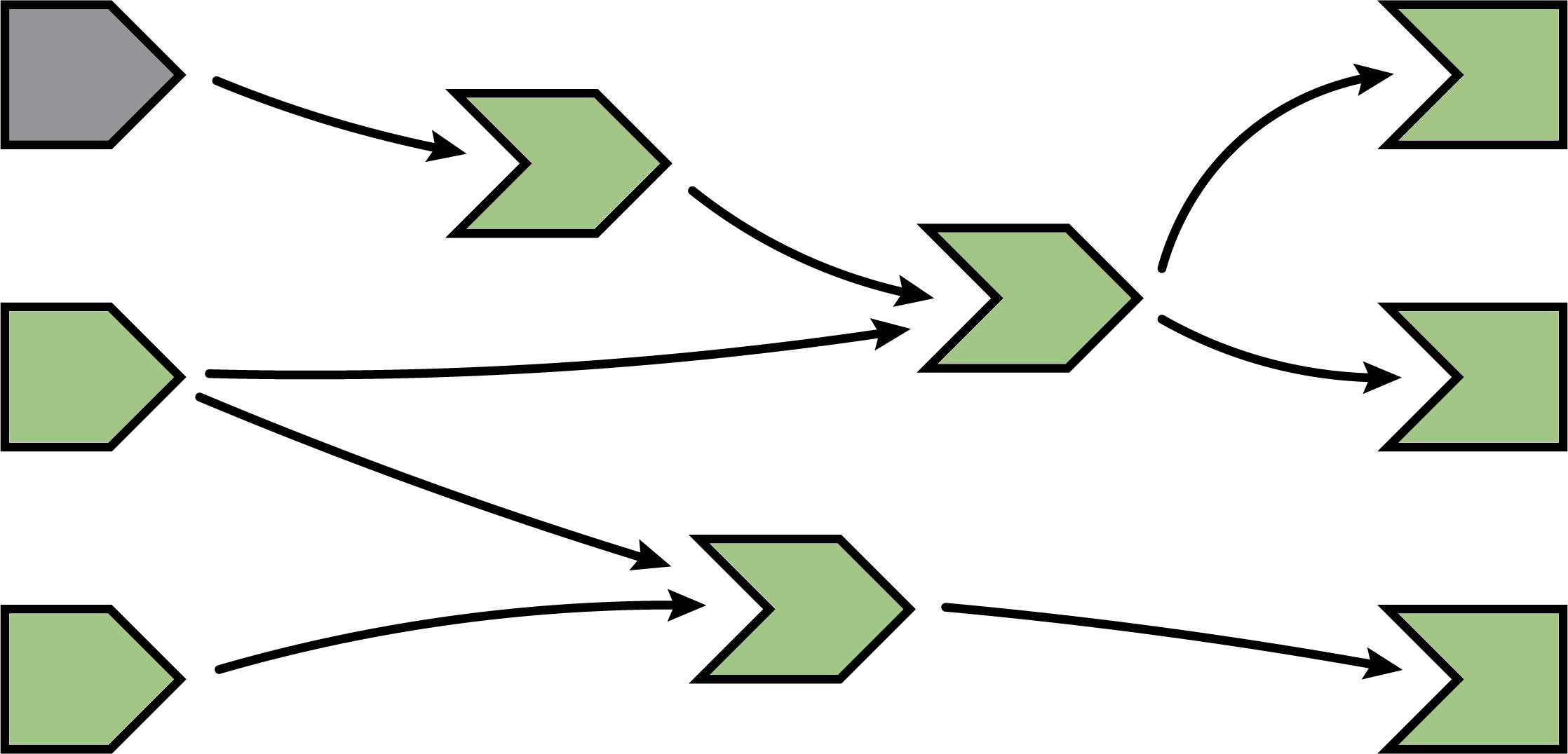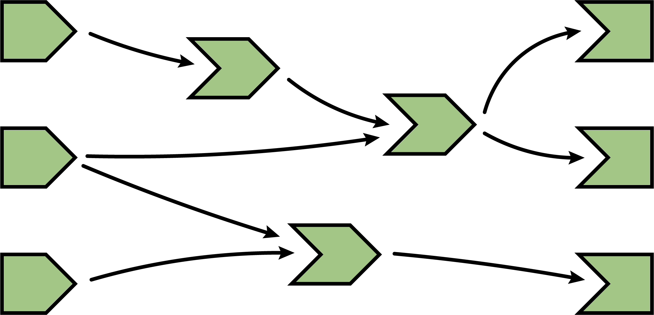 Below is a diagram of a reactive graph. The shapes on the left are reactive inputs (or values), the ones in the middle are reactive expressions, and on the right are observers (or outputs). The lines between the shapes are directional, with the arrows indicating the direction of their inter-dependencies. When a shiny app is loaded, this graph is discovered and formed. When a user interacts with the app and changes reactive input values, the graph is partially deconstructed and then reformed. The sub-sections that follow explain how this reactive life cycle works in detail. The reactlog visualization is designed to help you inspect each particular step in this reactive life cycle.